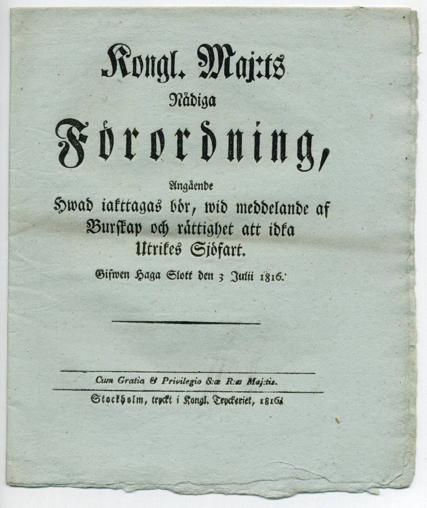 Kongl. maj:ts nådiga förordning, angående hwad iakttagas bör, wid meddelande af burskap och rättighet att idka utrikes sjöfart. Gifwen Haga slott den 3 julii 1816.