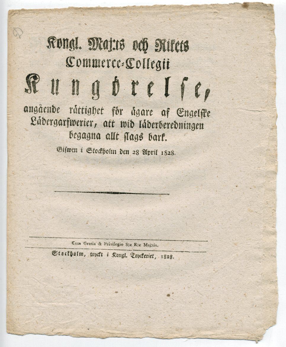 Kongl. maj:ts och rikets Commerce-collegii kungörelse, angående rättighet för ägare af engelske lädergarfwerier, att wid läderberedningen begagna allt slags bark. Gifwen i Stockholm den 28 april 1828.