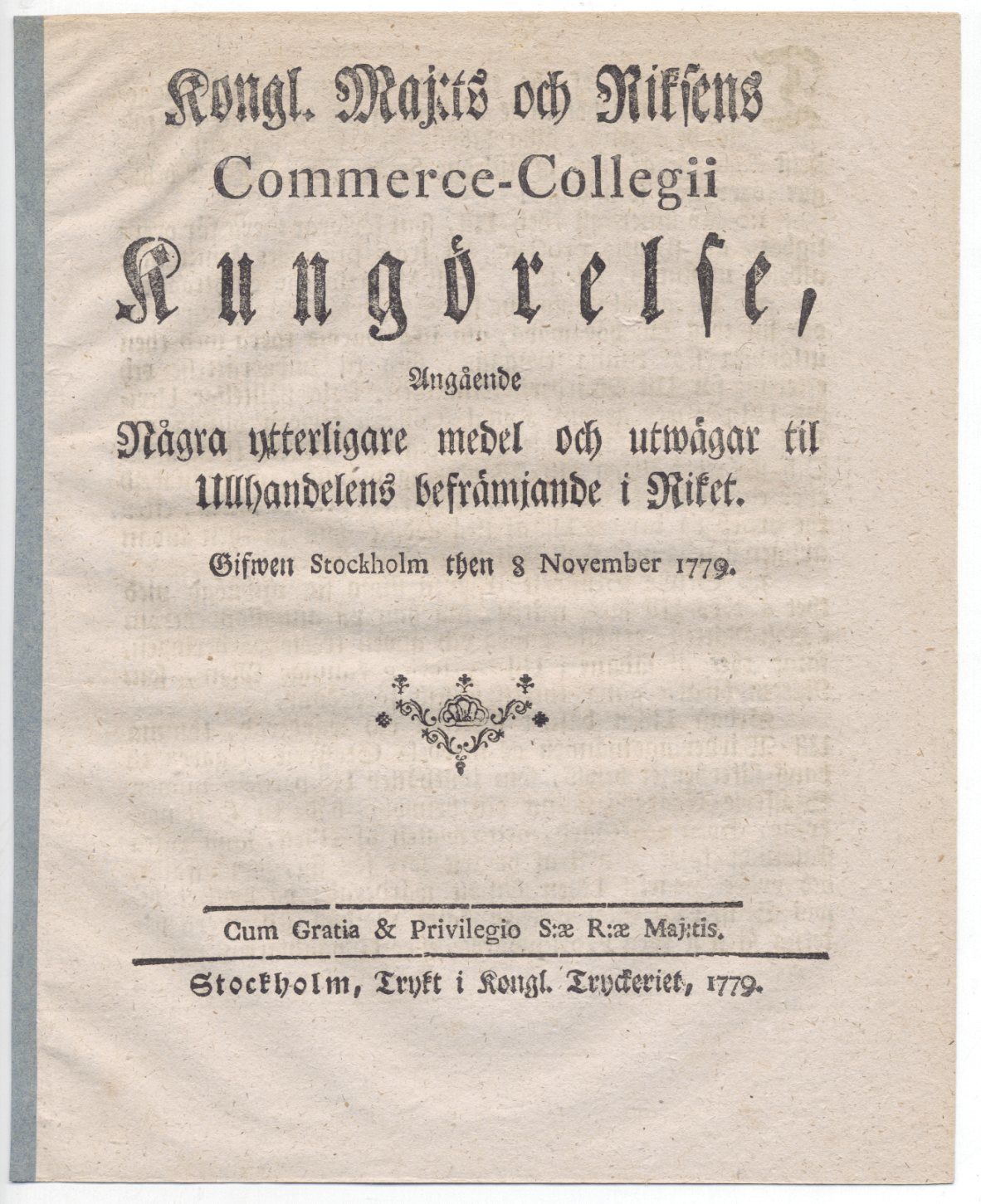 Kongl. maj:ts och riksens Commerce-collegii kungörelse, angående några ytterligare medel och utwägar til ullhandelens befrämjande i riket. Gifwen Stockholm then 8 november 1779.