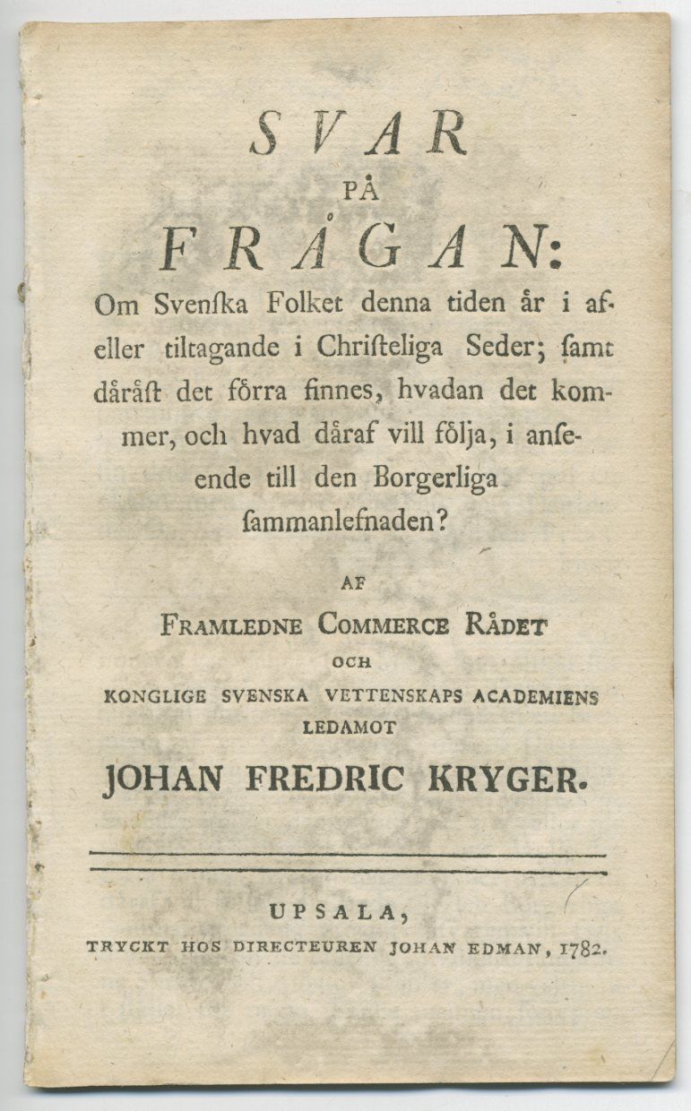 Svar på frågan: Om svenska folket denna tiden är i af- eller tilltagande i christeliga seder; samt däräst det förra finnes, hvadan det kommer, och hvad däraf vill följa, i anseende till den borgerliga sammanlefnaden?
