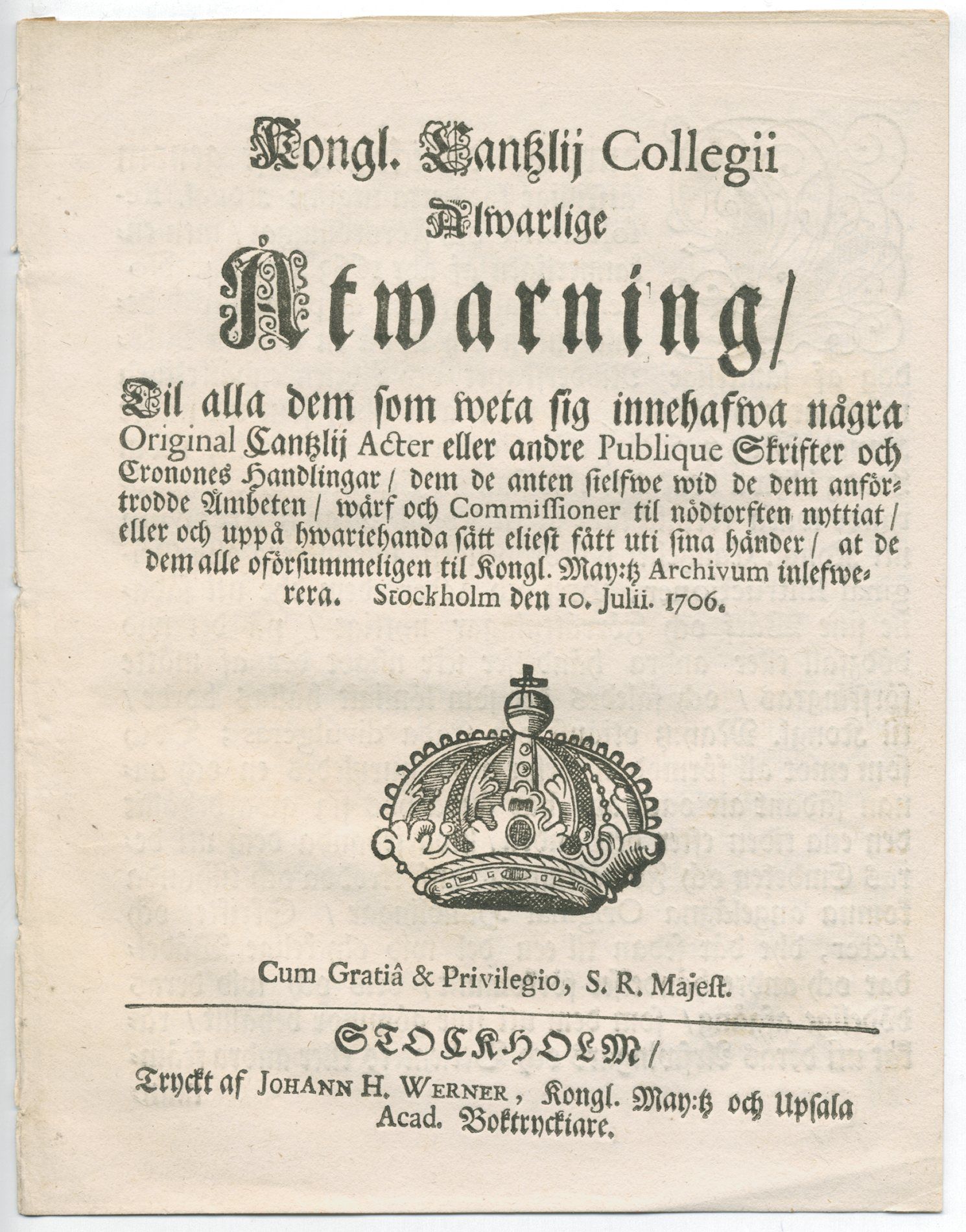 Kongl. Cantzlij collegii alwarlige åtwarning/ til alla dem som weta sig innehafwa några original cantzlij acter eller andre publicue skrifter och cronones handlingar/ dem de anten sielfwe wid de dem anförtrodde ämbeten/ wärf och commissioner til nödtorften nyttiat/ eller och uppå hwariehanda sätt eliest fått uti sina händer/ at de dem alle oförsummeligen til Kongl. may:tz archivum inlefwerera. Stockholm den 10 julii 1706.