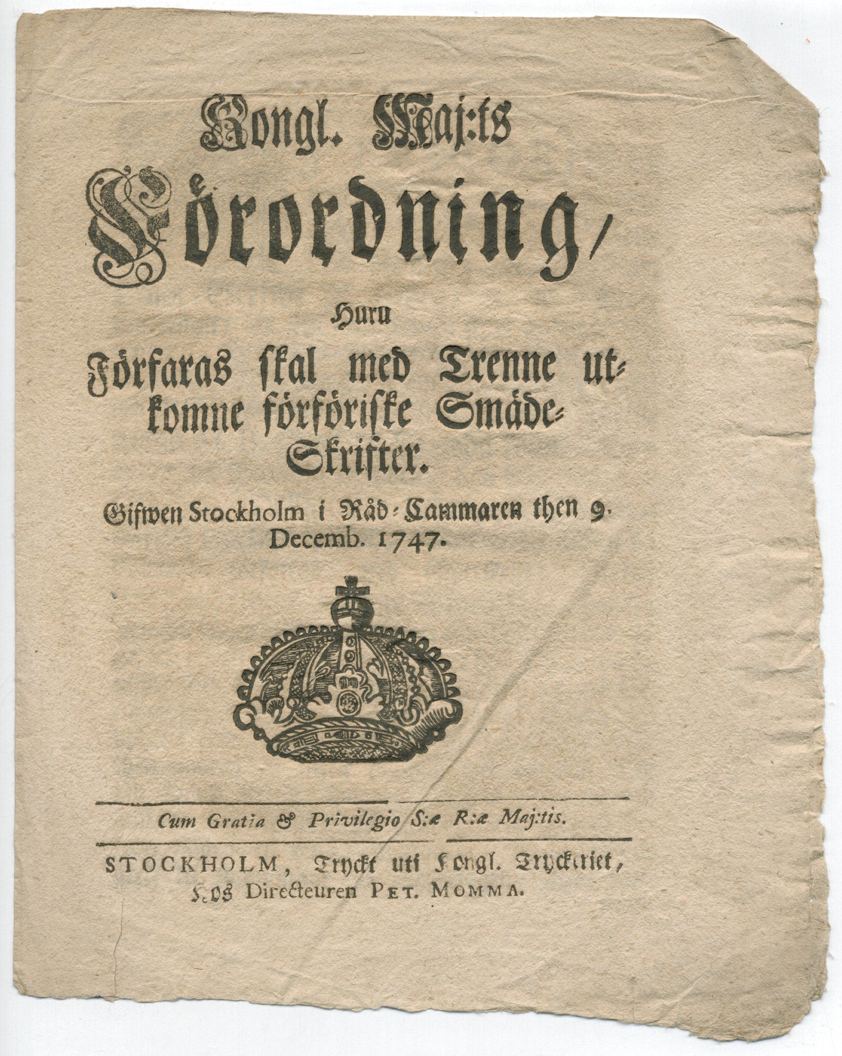 Kongl. maj:ts förordning/ huru förfaras skal med trenne utkomne förföriske smädeskrifter. Gifwen Stockholm i råd-cammaren then 9 decemb. 1747.