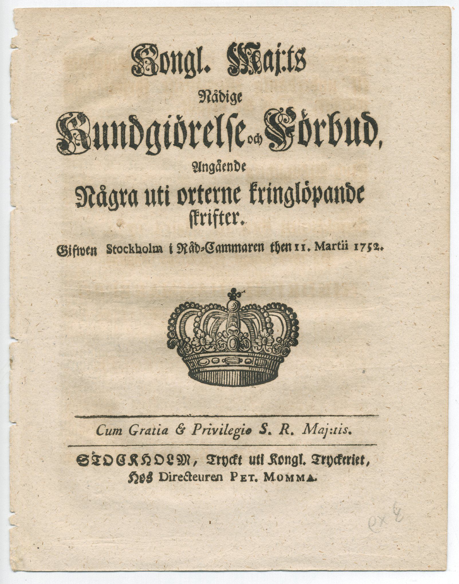 Kongl. maj:ts nådige kundgiörelse och förbud, angående några uti orterne kringlöpande skrifter. Gifwen Stockholm i råd-cammaren then 11 martii 1752.