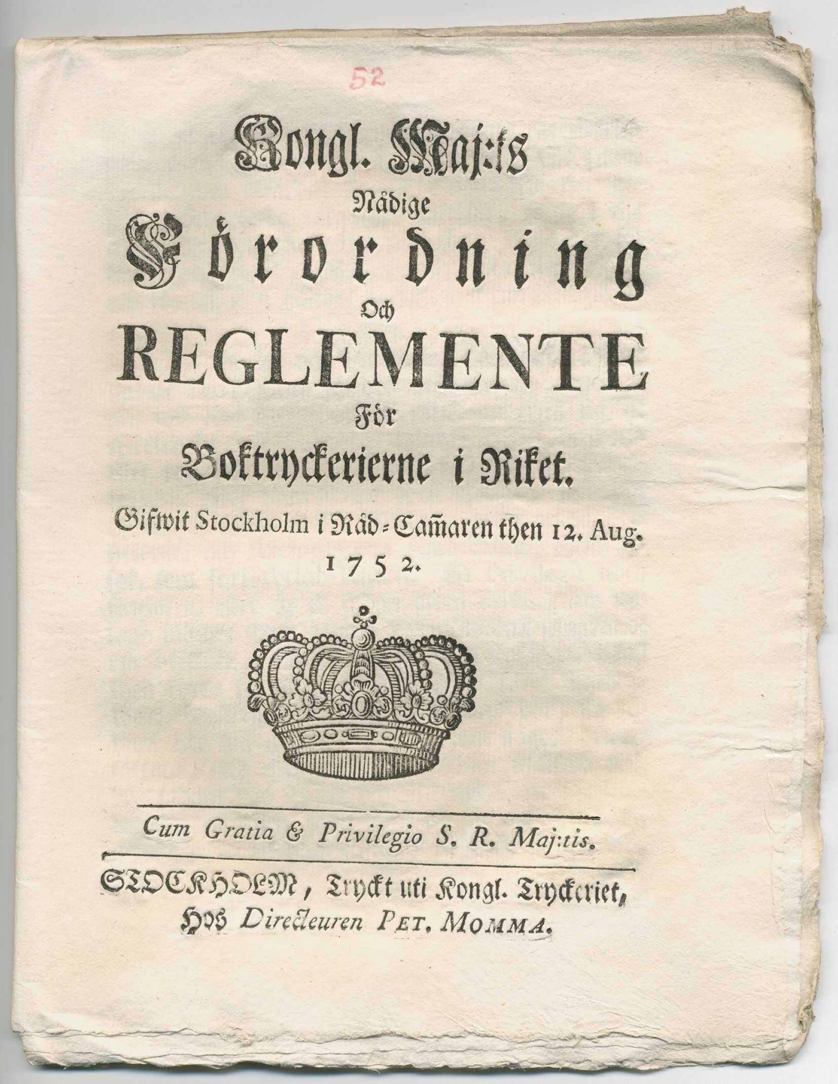 Kongl. maj:ts nådige förordning och reglemente för boktryckerierne i riket. Gifwit Stockholm i råd-cammaren then 12 aug. 1752.