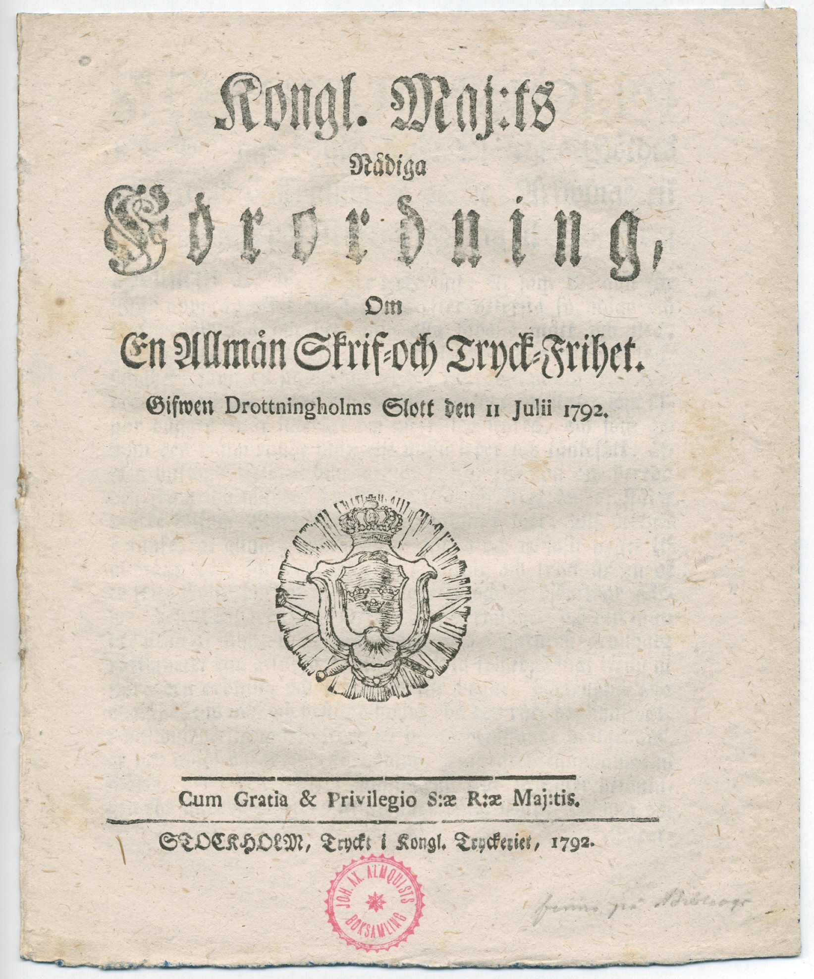 Kongl. maj:ts nådiga förordning, om en allmän skrif- och tryck-frihet. Gifwen Drottningholms slott den 11 julii 1792.