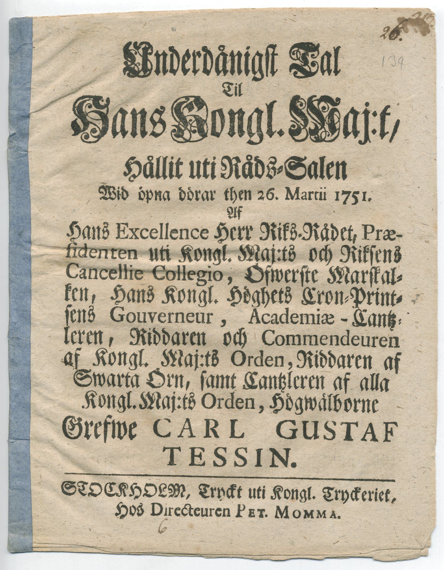 Underdånigst tal till hans kongl. maj:t, hållit uti råds-salen wid öpna dörar then 26 martii 1751.