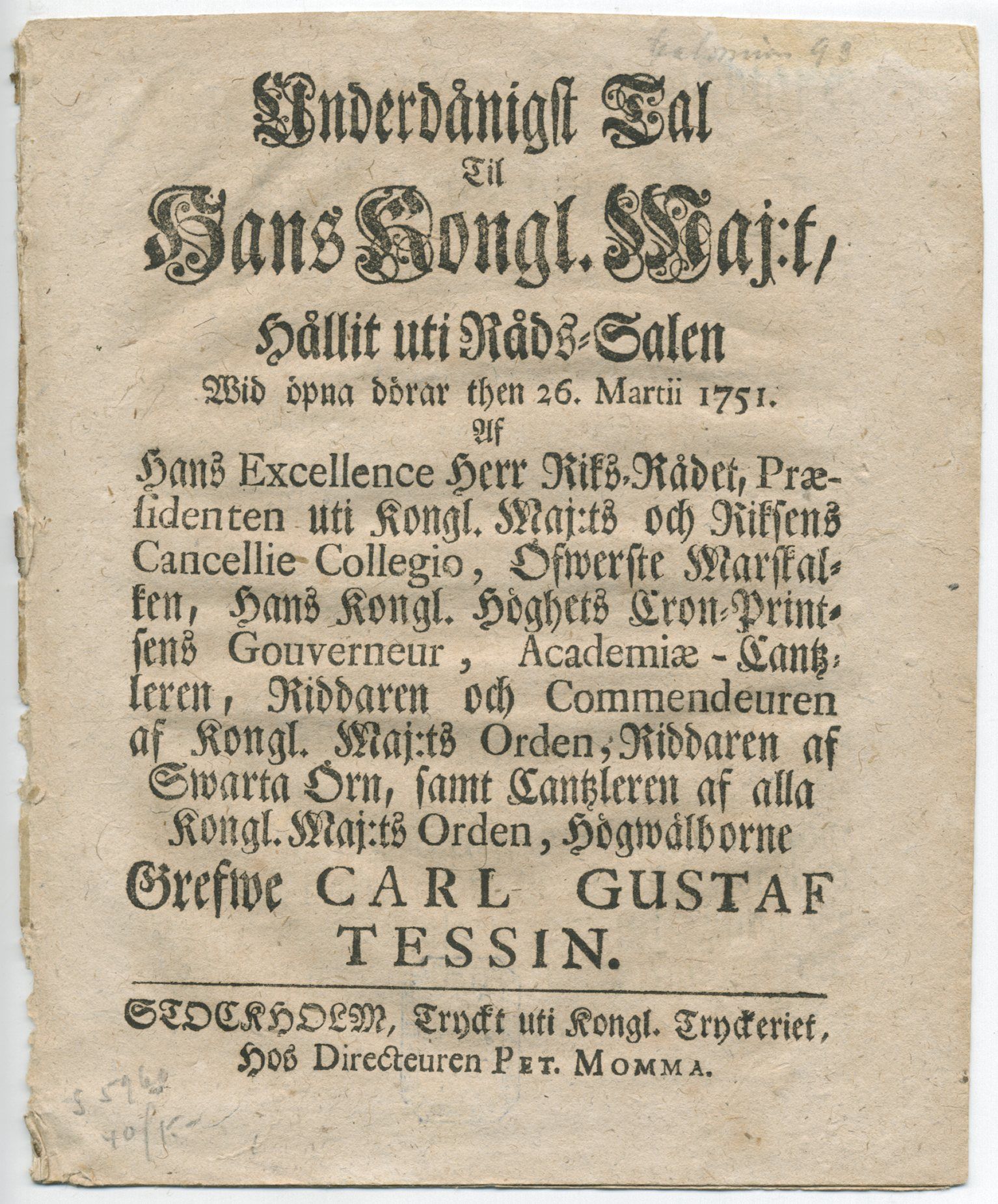 Underdånigst tal till hans kongl. maj:t, hållit uti råds-salen wid öpna dörar then 26 martii 1751.
