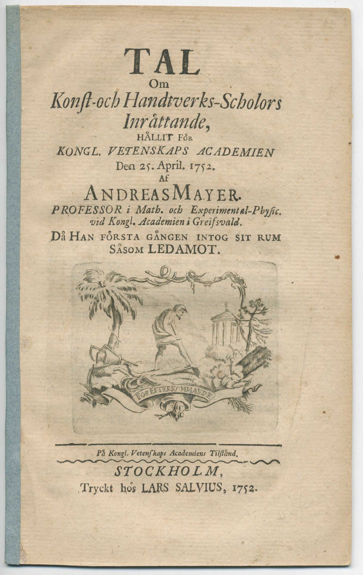 Tal om konst- och handtverks-scholors inrättande, hållit för kongl. Vetenskaps academien den 25 april 1752 [...] då han första gången intog sit rum såsom ledamot.