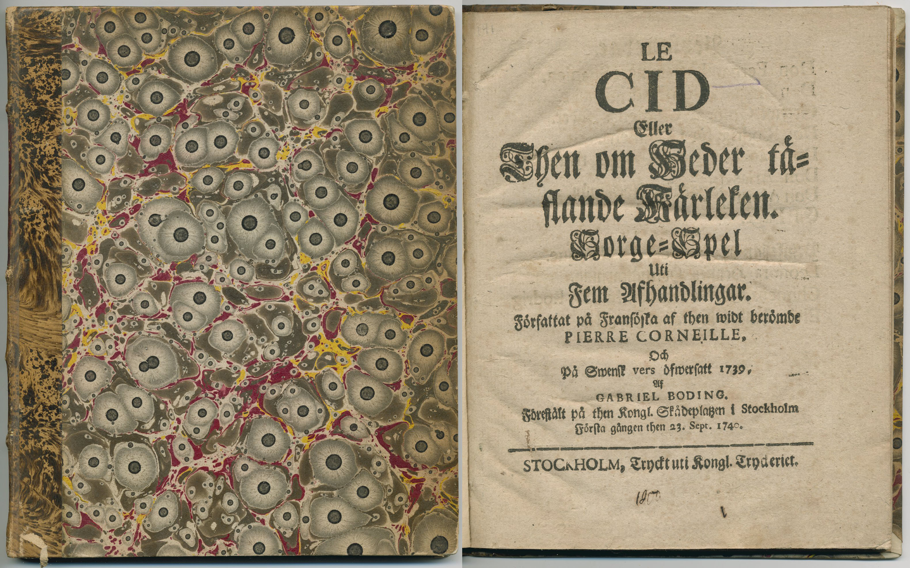 Le Cid eller then om heder täflande kärleken. Sorge-spel uti fem afhandlingar. Författat på fransöska af then widt berömde Pierre Corneille, och på swensk vers öfwersatt 1739, af Gabriel Boding. Förestält på then kongl. skådeplatzen i Stockholm första gången then 23 sept. 1740.