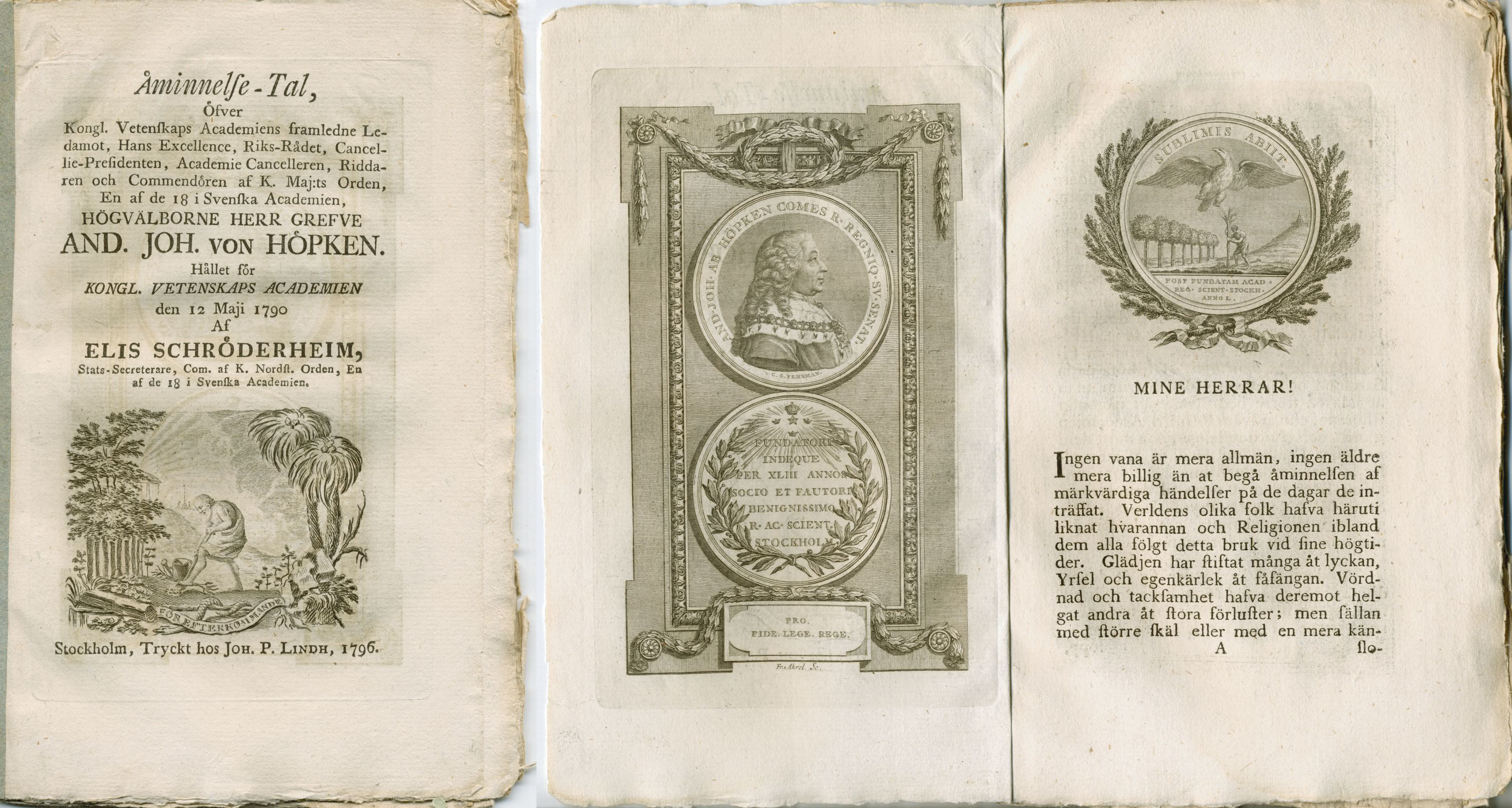 Åminnelse-tal, öfver kongl. Vetenskaps academiens framledne ledamot, hans excellence, riks-rådet, cancellie-presidenten, academie cancelleren, riddaren och commendören af k. maj:ts orden, en af de 18 i Svenska academien, högvälborne herr grefve And. Joh. von Höpken. Hållet för kongl. Vetenskaps academien den 12 maji 1790.