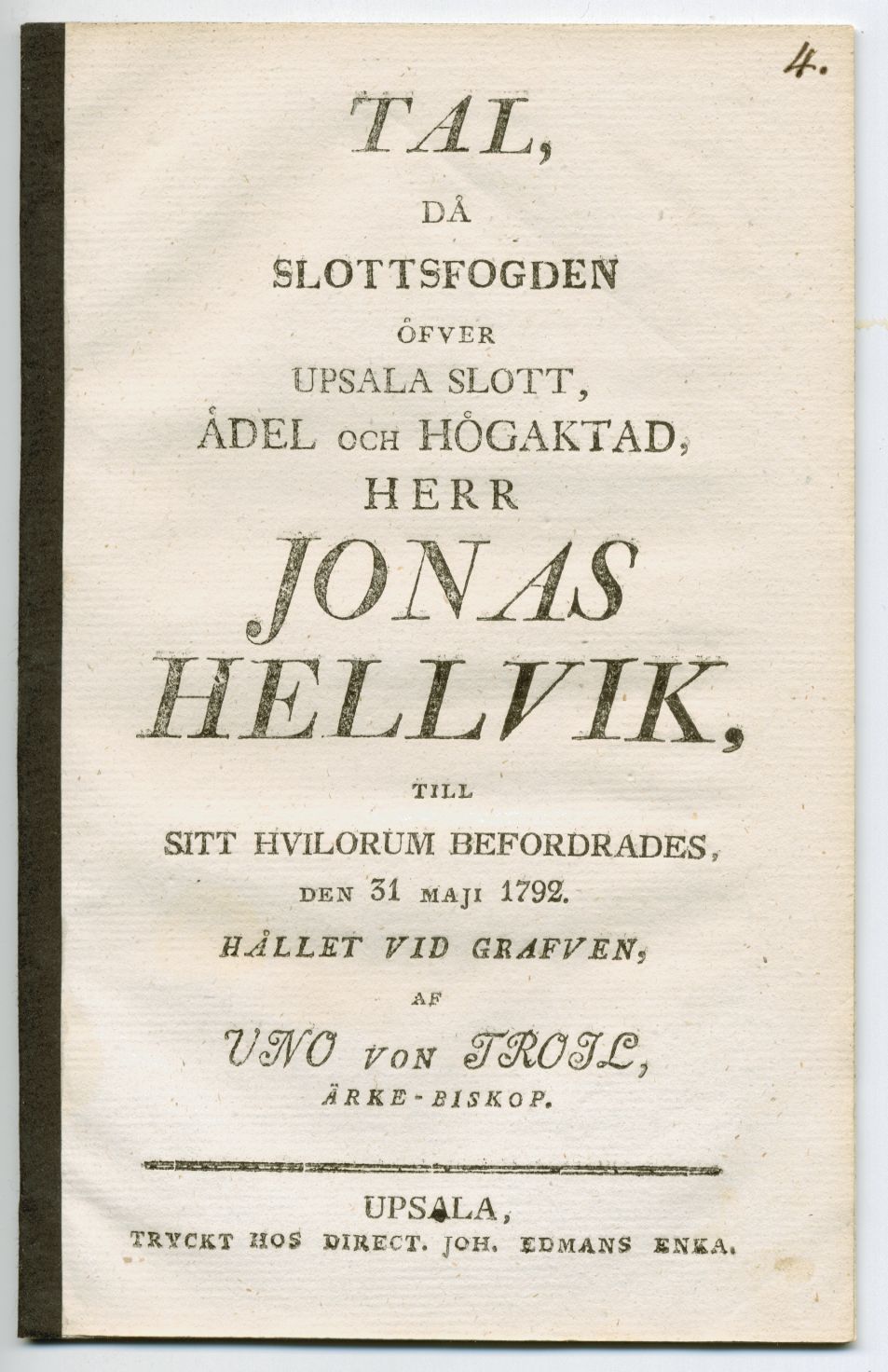 Tal, då slottsfogden öfver Upsala slott, ädel och högaktad, herr Jonas Hellvik, till sitt hvilorum befordrades, den 31 maji 1792 hållet vid grafven.