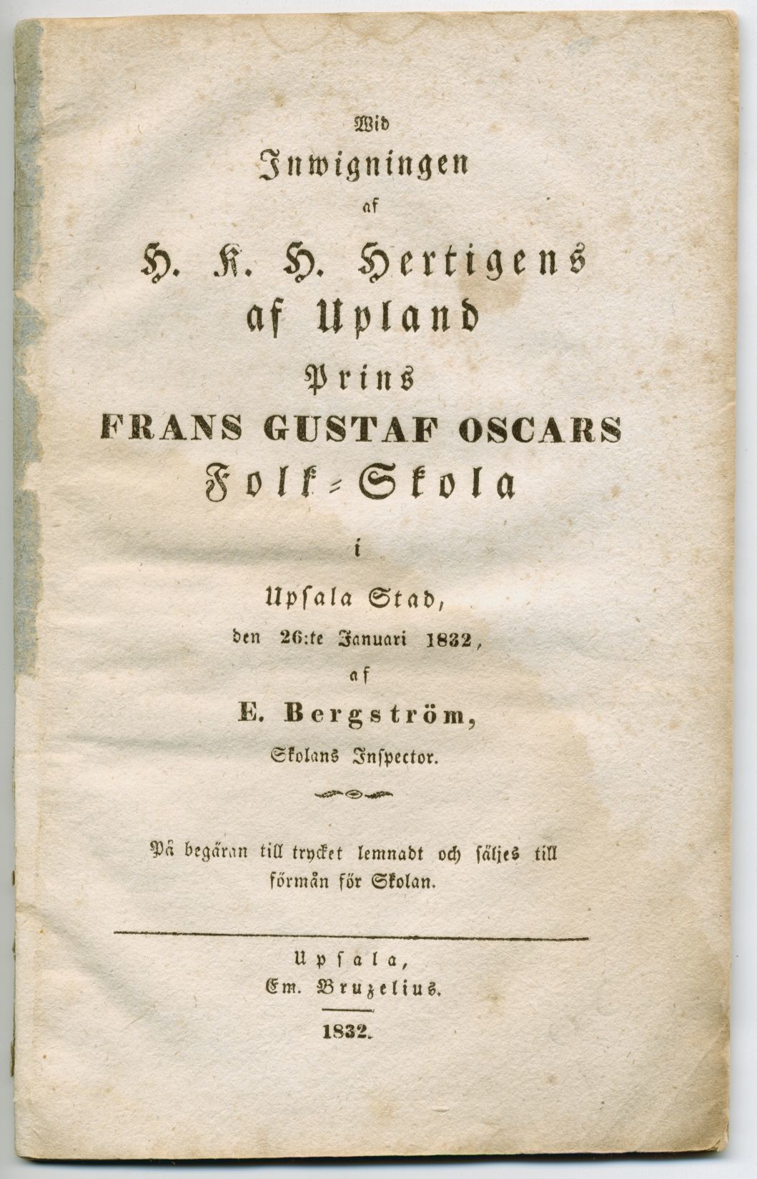 Wid inwigningen af h.k.h. hertigens af Upland prins Frans Gustaf Oscars folk-skola i Uppsala stad, den 26:te januari 1832. På begäran till trycket lemnadt och säljes till förmån för skolan.