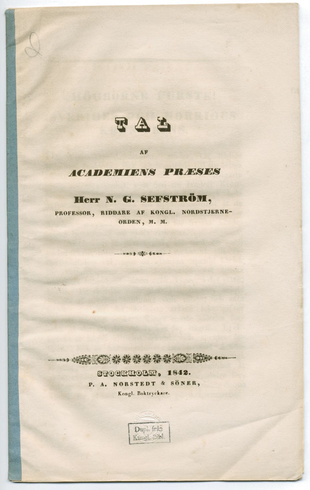Sthlm, P. A. Norstedt & söner, 1842. 8:o. 12 s.Häftad med blå samtida ryggremsa. Vikt i nedre hörnet. Med Kungliga bibliotekets blindstpl och duplettstpl på titelbladet.