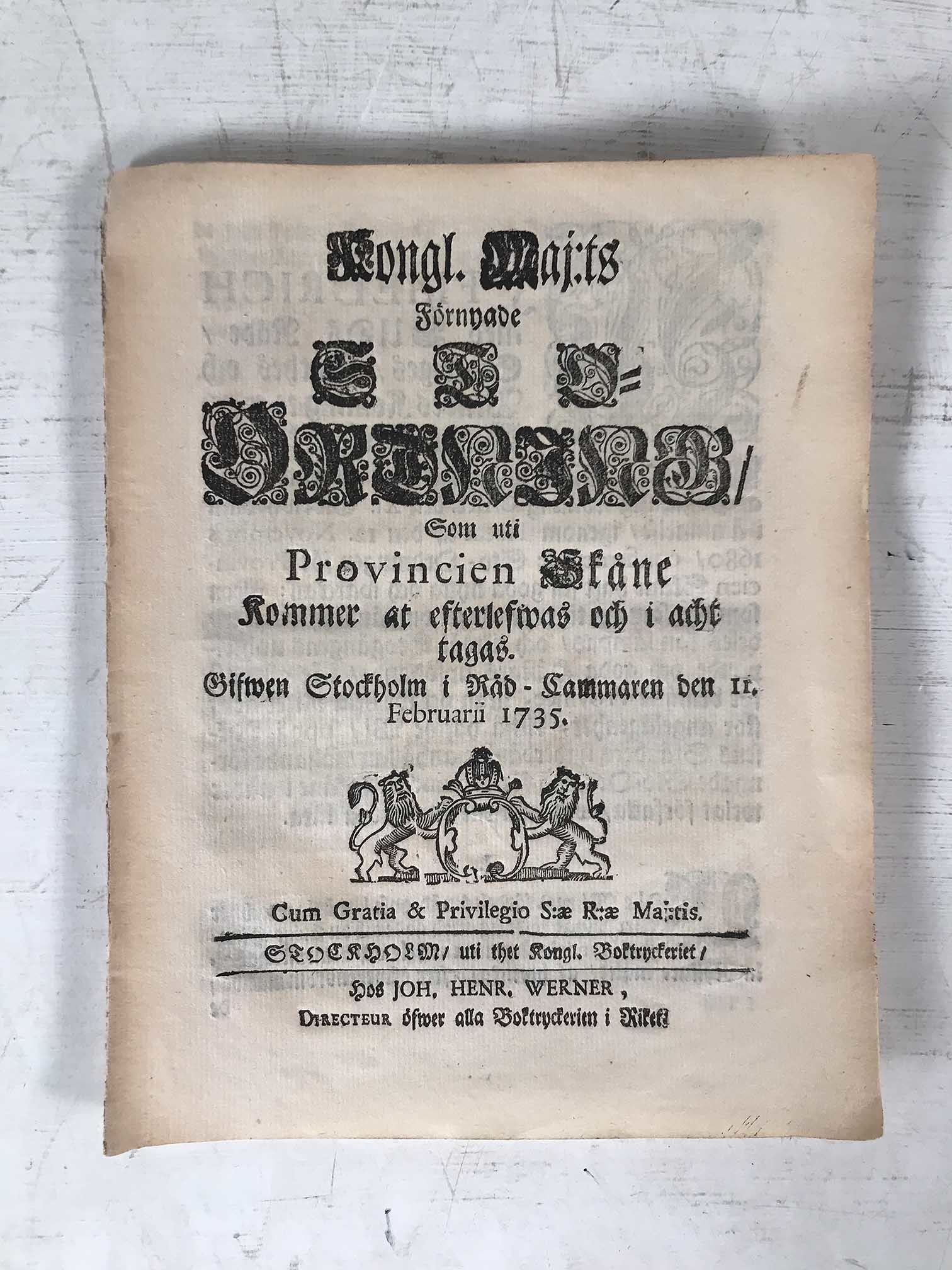 Kongl. maj:ts förnyade sto-ordning/ som uti provincien Skåne kommer at efterlefwas och i acht tagas. Gifwen Stockholm i råd-cammaren den 11 februarii 1735.