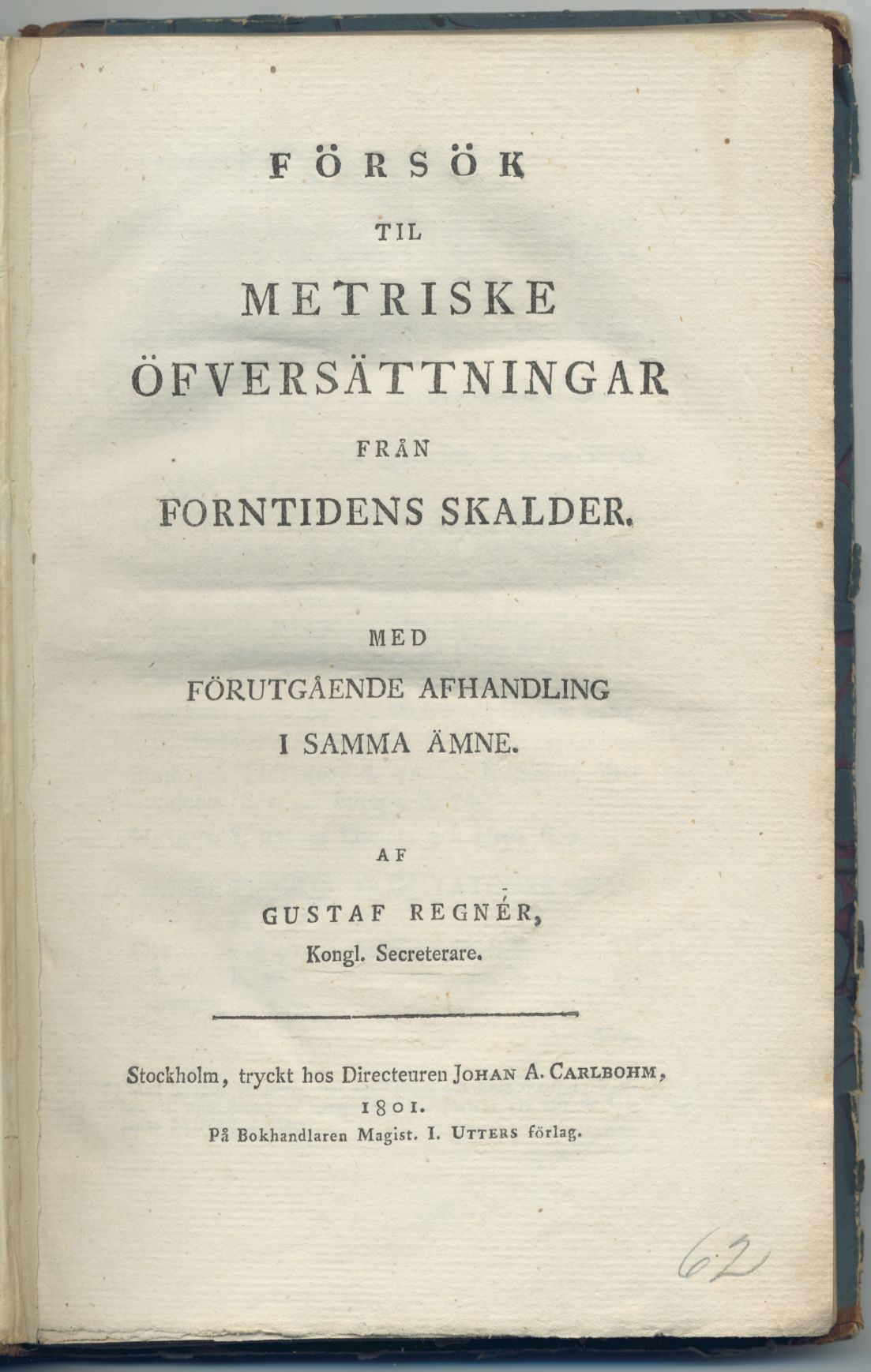 Med översättningar av Homeros, Sappho, Anakreon, Theokritos, Bion, Moschos, Musaios, Catullus, Vergilius, Tibullus, Propertius, Horatius och Ovidius. Gustaf Regnérs (1748–1819) ”Försök til metriske öfversättningar” markerar en ny epok i de svenska antiköversättningarnas historia. Redan som utgivare av ”Svenska Parnassen” 1784–86 hade han publicerat en del metriska tolkningar, men där dominerar ännu den rimmade versen och någon diskussion om valet av versmått förs inte. Det är först i denna boks långa inledande uppsats, “Afhandling om metriske öfversättningar samt grunderne til en svensk metrik”, som han presenterar sina i Sverige nydanande tankar kring översättning och prosodi. Regnér visar sig här som en förespråkare för den från Tyskland stammande nyhumanismen med dess krav på metrisk och stilistisk trohet. Det konventionella franska manéret förkastas och i stället söker han sina förebilder ur den tyska vitterheten samt förordar den orimmade versens företräden framför den rimmade alexandrinen. Även om de översatta exemplen delvis är ganska svaga manade hans försök till efterföljd och hans principer blev dominerande under första halvan av 1800-talet. För dessa översättningar belönades han 1802 av Svenska akademien med det Lundbladska priset.