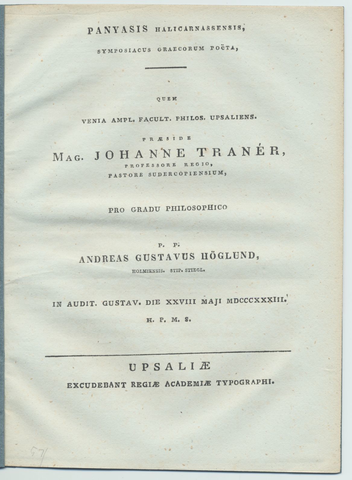 Uppsala, Regiæ academiæ typographi, (1833). 4:o. (2),10 s. Tagen ur band och insatt i nyare blått omslag. Gamla stänkta snitt. På blåtonat papper.