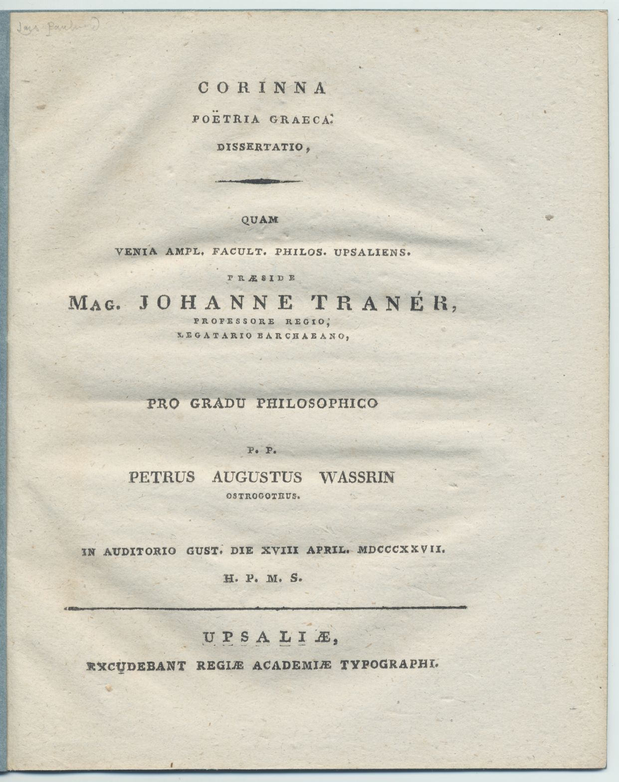 Marklin Catalogus disputationum 143. Utgör en del i Tranérs samling av de nio grekiska poetissorna, ”Novem graecarum poëtridum, quae supersunt, carmina”. Korinna från Tanagra troddes förr ha varit samtida med Pindaros, alltså verksam på 400-talet f.Kr., men modern forskning har velat placera henne i hellenistisk tid. Av hennes dikting är bara fragment bevarade och i denna avhandling återges ett fåtal rader på grekiska och i svensk översättning.