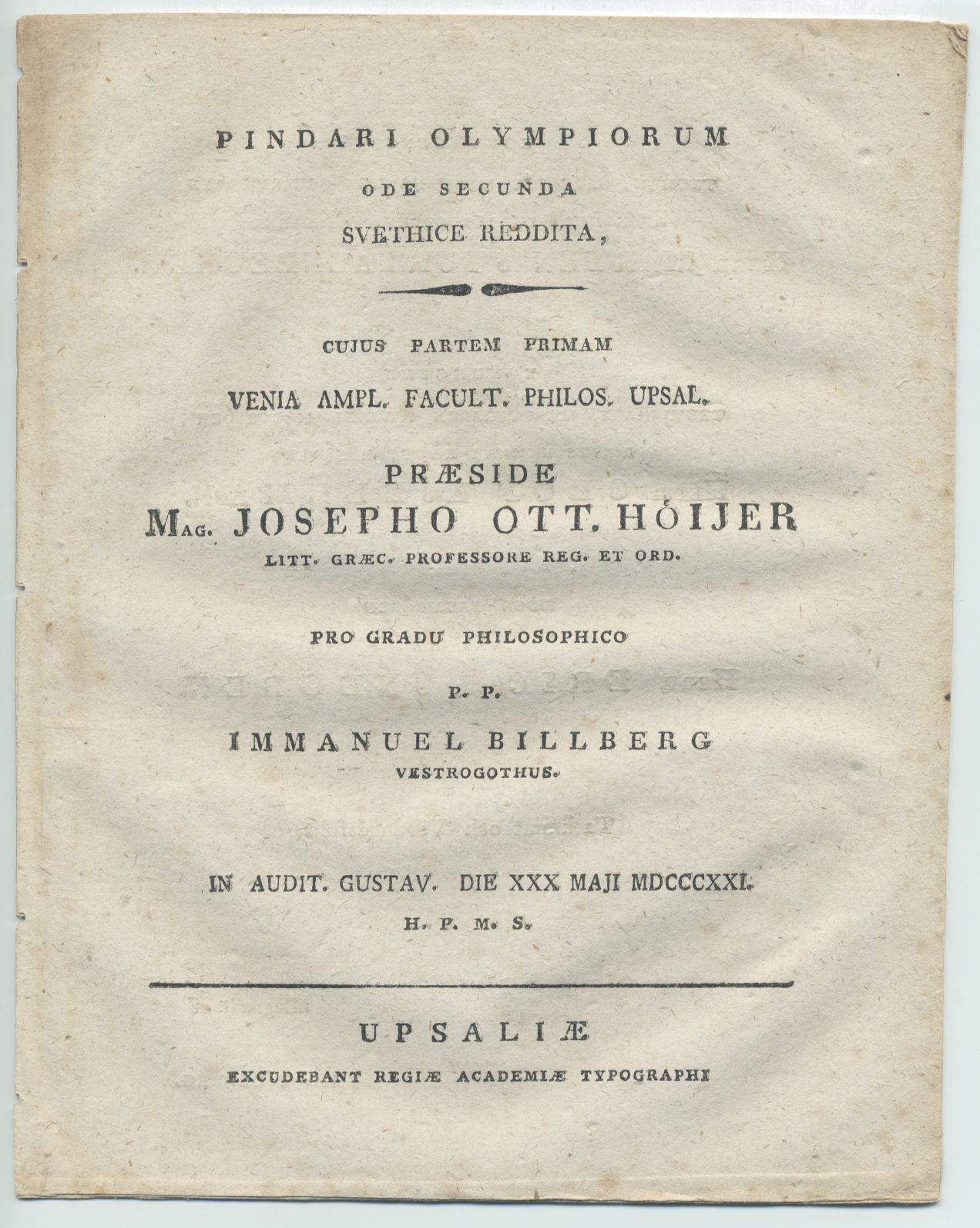 [Pindaros] HÖIJER, JOSEPH OTTO [preses] & BILLBERG, IMMANUEL [respondent].