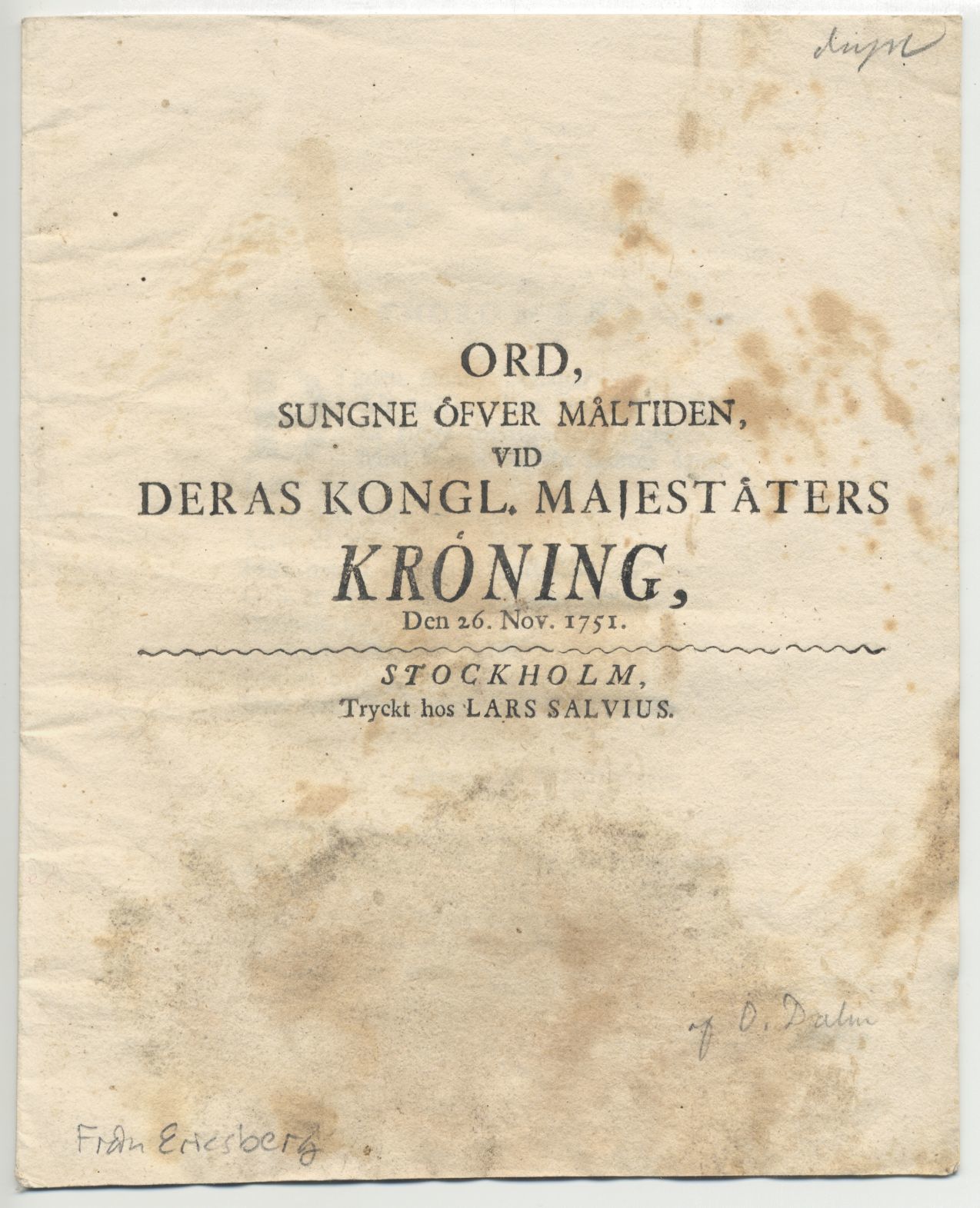 Sthlm, L. Salvius, (1751). 4:o. (7) s. Häftad. Titelbladet med stora fula fukt- och mögelfläckar. Kungliga bibliotekets duplettmarkering i blyerts. Slutsignaturen ”O. D.” ifylld ”-alin” med blyerts. Från Ericsberg.