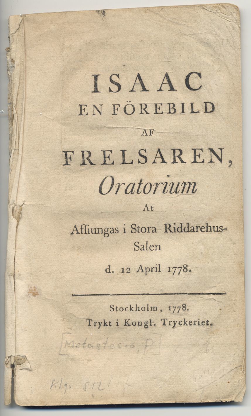Isaac en förebild af frelsaren, oratorium at afsiungas i Stora Riddarehus-salen d. 12 april 1778.