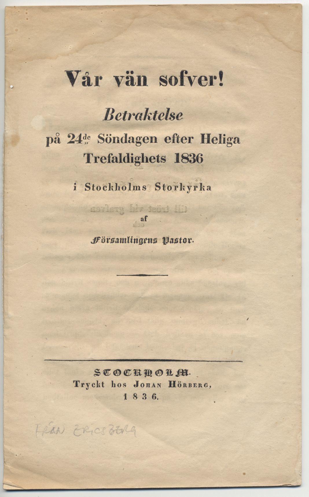 Vår vän sofver! Betraktelse på 24de söndagen efter heliga trefaldighets 1836 i Stockholms Storkyrka af församlingens pastor.