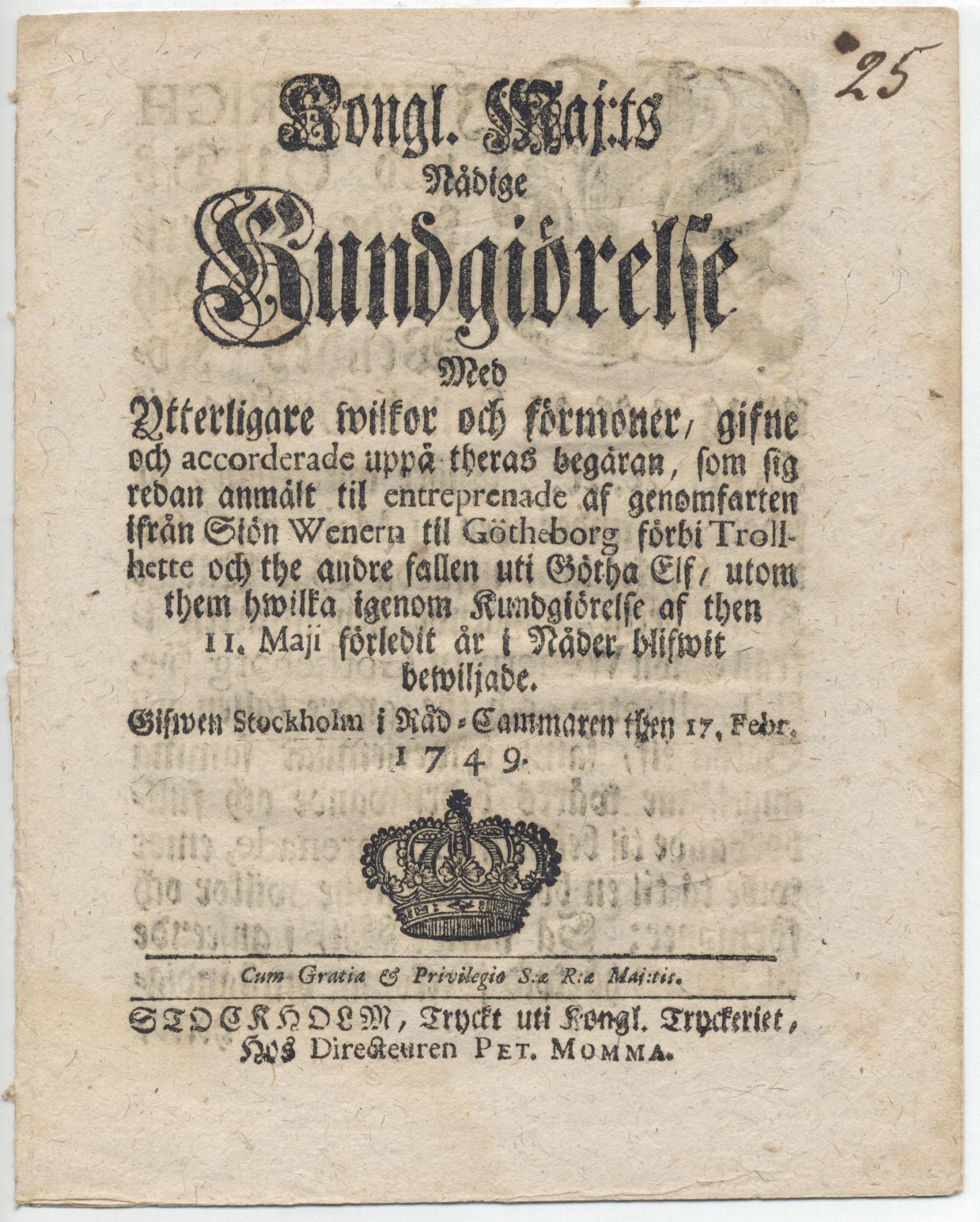 Kongl. maj:ts nådige kundgiörelse med ytterligare wilkor och förmoner, gifne och accorderade uppå theras begäran, som sig redan anmält til entreprenade af genomfarten ifrån siön Wenern til Götheborg förbi Trollhette och the andre fallen uti Götha elf, utom them hwilka igenom kundgiörelse af then 11 maji förledit år i nåder blifwit bewiljade. Gifwen Stockholm i råd-cammaren then 17 febr. 1749.