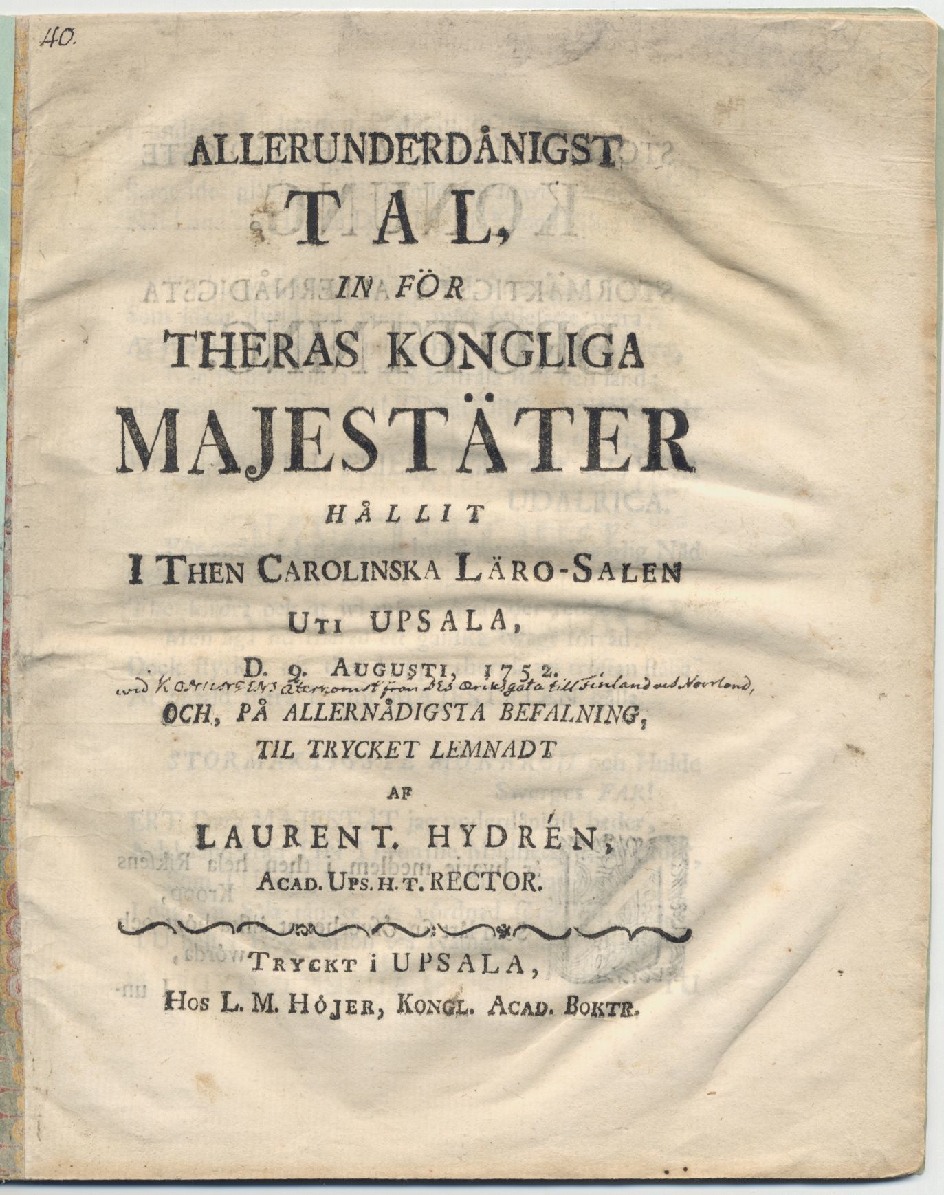 Allerunderdånigst tal, in för theras kongliga majestäter hållit i then Carolinska läro-salen uti Upsala, d. 9 augusti, 1752 och, på allernådigsta befalning, til trycket lemnadt.