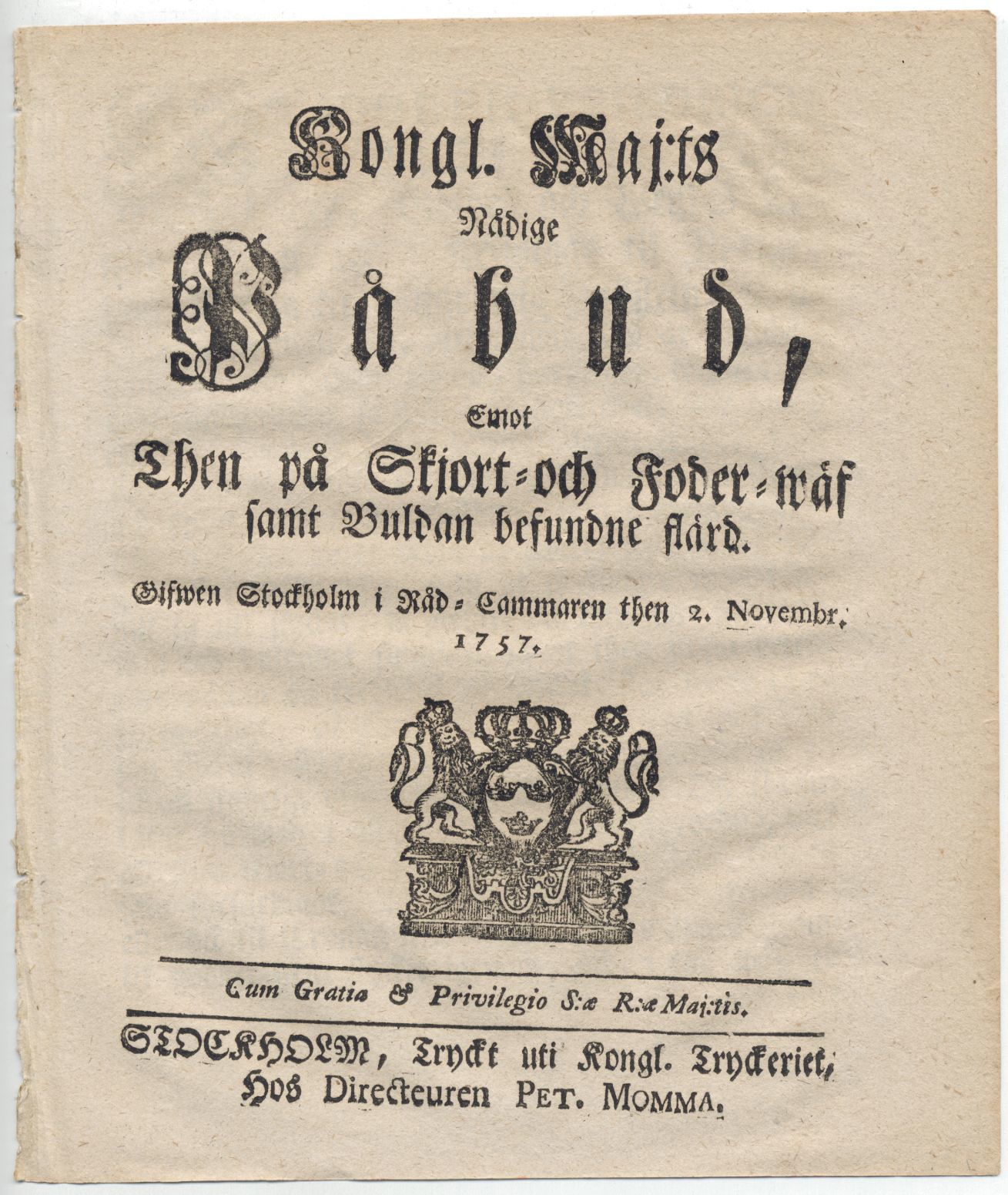 Kongl. maj:ts nådige påbud, emot then på skjort- och foder-wäf samt buldan befundne flärd. Gifwen Stockholm i råd-cammaren then 2 novembr. 1757.