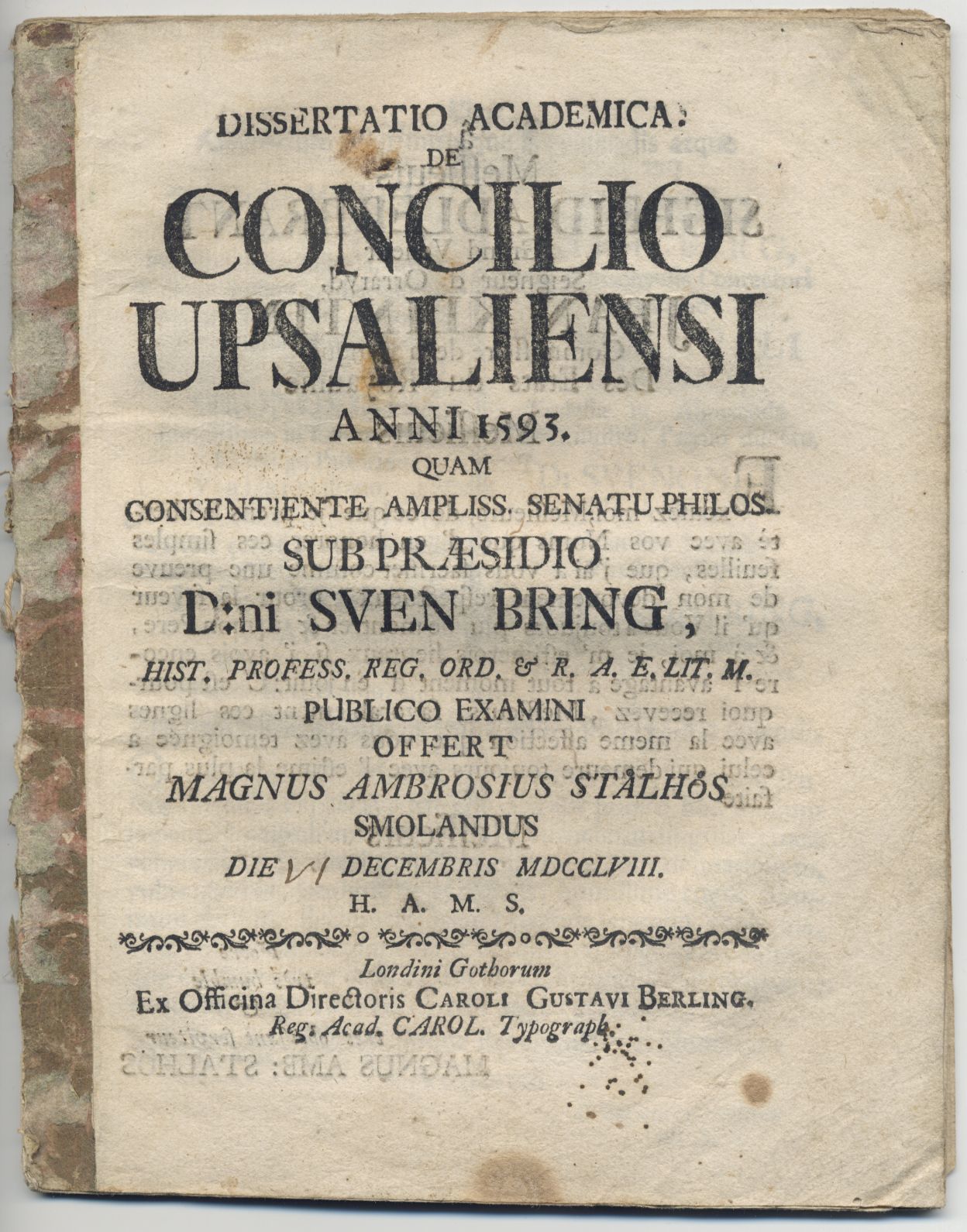 Liden Catalogus disputationum 161. Warmholtz Bibliotheca historica Sueo-Gothica 2310: ”Författaren har följt Nic. Olai Bothiens. korta undervisning och Arnold. Messenius. Tryckfelen i denna disput. är oräknelige”. Med hyllningar av Andr. Ring, M. S. Klintin och Caspar Liefertz. Om kyrkomötet i Uppsala 1593.