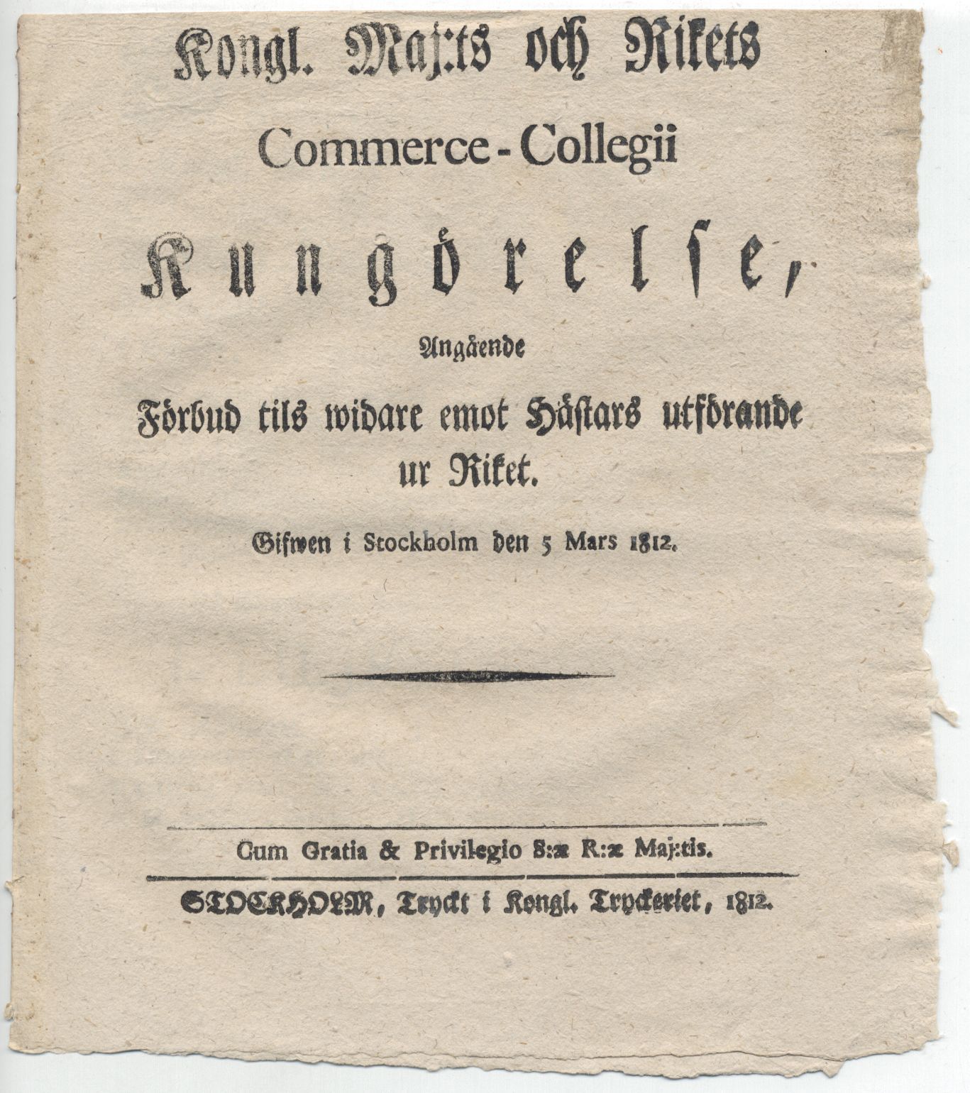 Kongl. maj:ts och rikets Commerce-collegii kungörelse, angående förbud tils widare emot hästars utförande ur riket. Gifwen i Stockholm den 5 mars 1812.