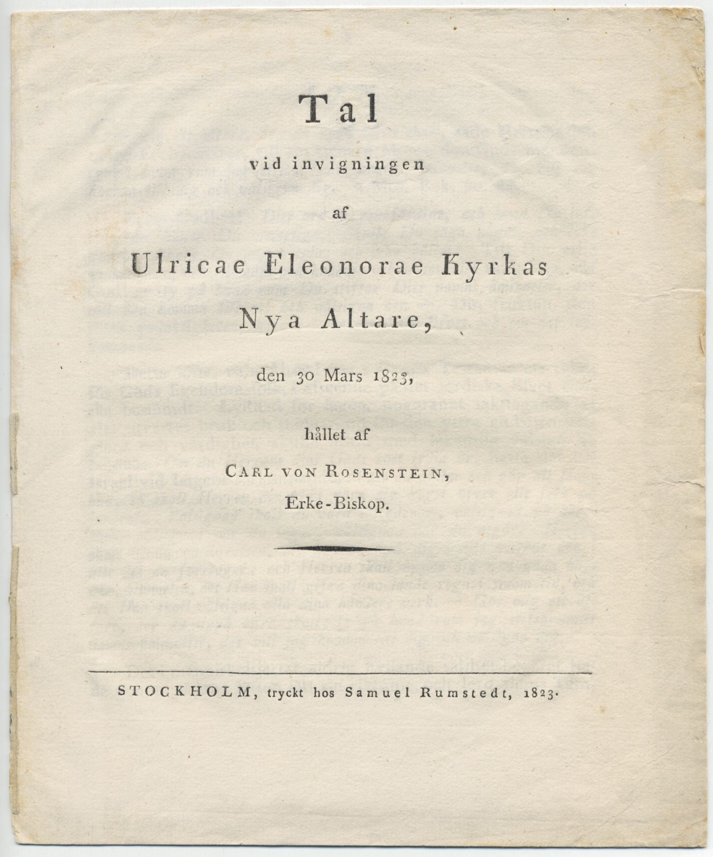 Sthlm, S. Rumstedt, 1823. 4:o. 8 s. Häftad med små spår av gammal ryggremsa. Lätt nött. Bra ex.