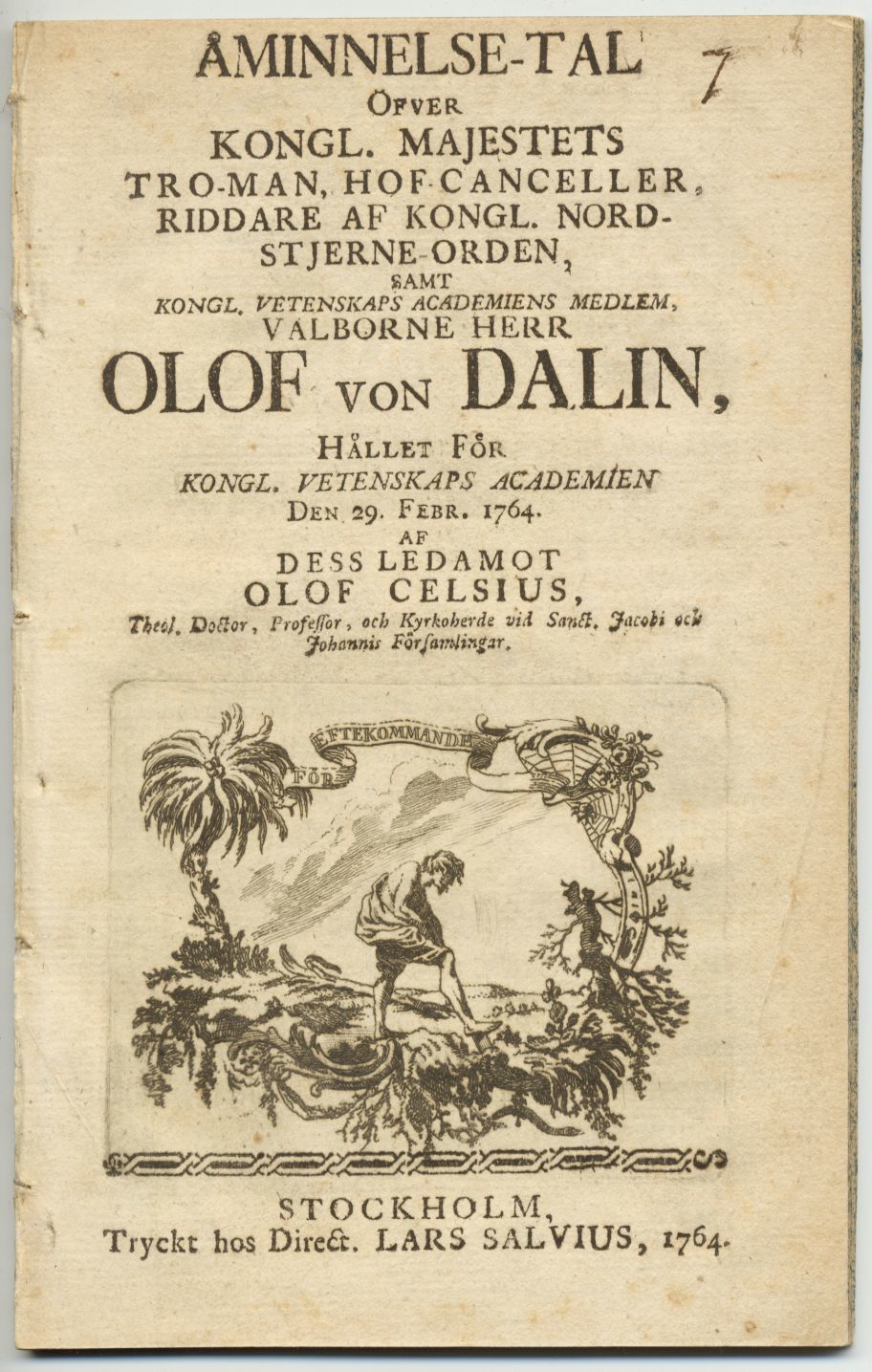 Åminnelse-tal öfver kongl. majestets tro man, hof canceller, riddare af kongl. Nordstjerne orden, samt kongl. Vetenskaps academiens medlem, välborne herr Olof von Dalin, hållet för kongl. Vetenskaps academien den 29 febr. 1764.