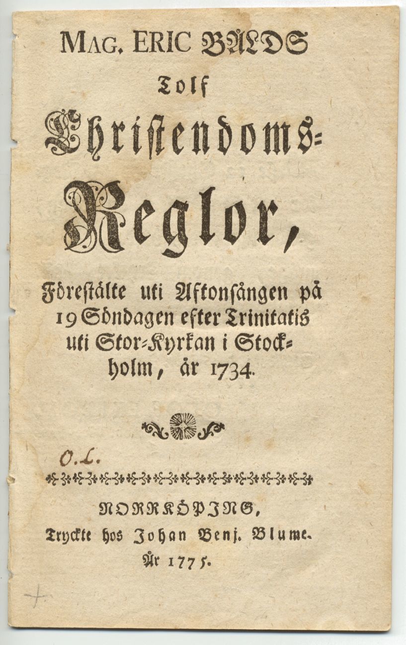 Norrköping, J. B. Blume, 1775. 8:o. 15 s. Tagen ur band. Genomgående fuktfläck och lös i häftningen. Gammal bläcksignatur, ”O. L.”
