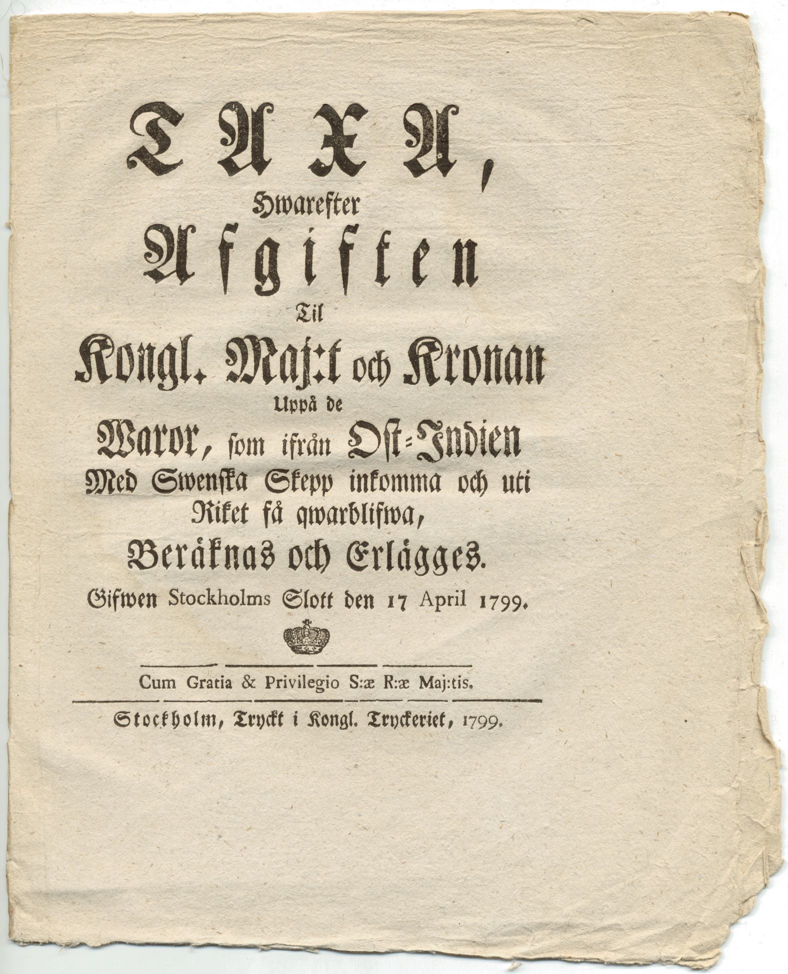 Taxa, hwarefter afgiften til kongl. maj:t och kronan uppå de waror, som ifrån Ost-Indien med swenska skepp inkomma och uti riket få qwarblifwa, beräknas och erlägges. Gifwen Stockholms slott den 17 april 1799.