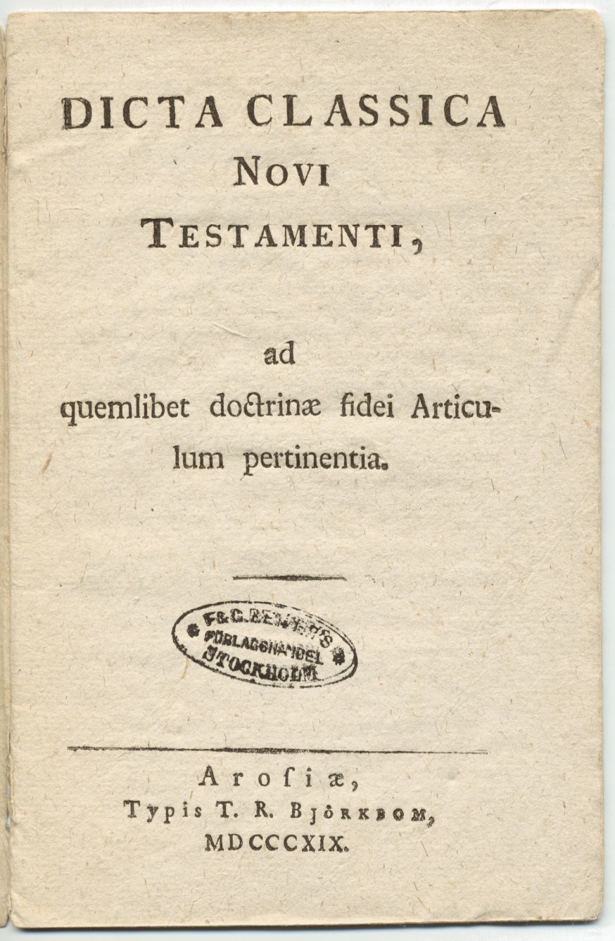 Västerås, T. R. Björkbom, 1819. 8:o. 13 s. Häftad i samtida gråpappersomslag. Stpl från Beijers förlagshandel på titelbladet.