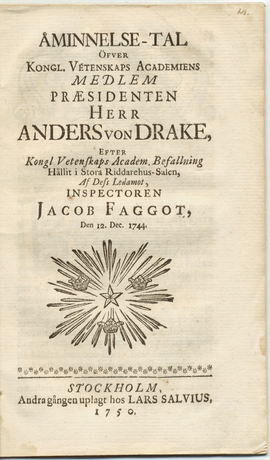 Åminnelse-tal öfver kongl. Vetenskaps academiens medlem presidenten herr Anders von Drake, efter kongl. Vetenskaps academiens befalning hållit i stora Riddarehus-salen, af dess ledamot, den 12 dec. 1744.