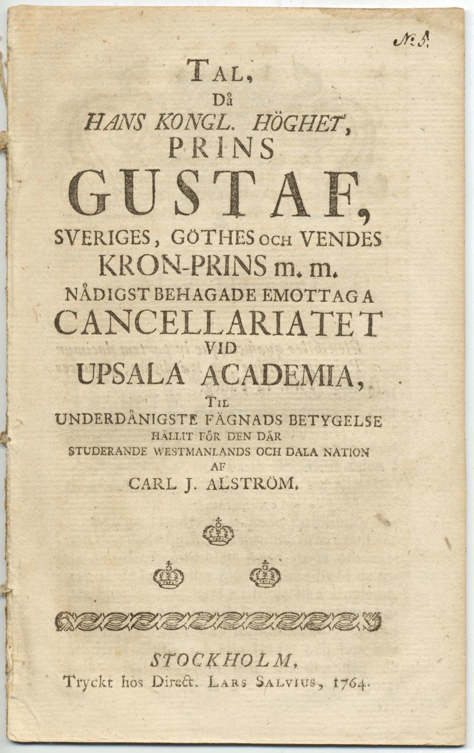 Tal, då hans kongl. höghet, prins Gustaf, Sveriges, Göthes och Vendes kron-prins m.m. nådigst behagade emottaga cancellariatet vid Upsala academia, til underdånigste fägnads betygelse hållit för den där studerande Westmanlands och Dala nation.