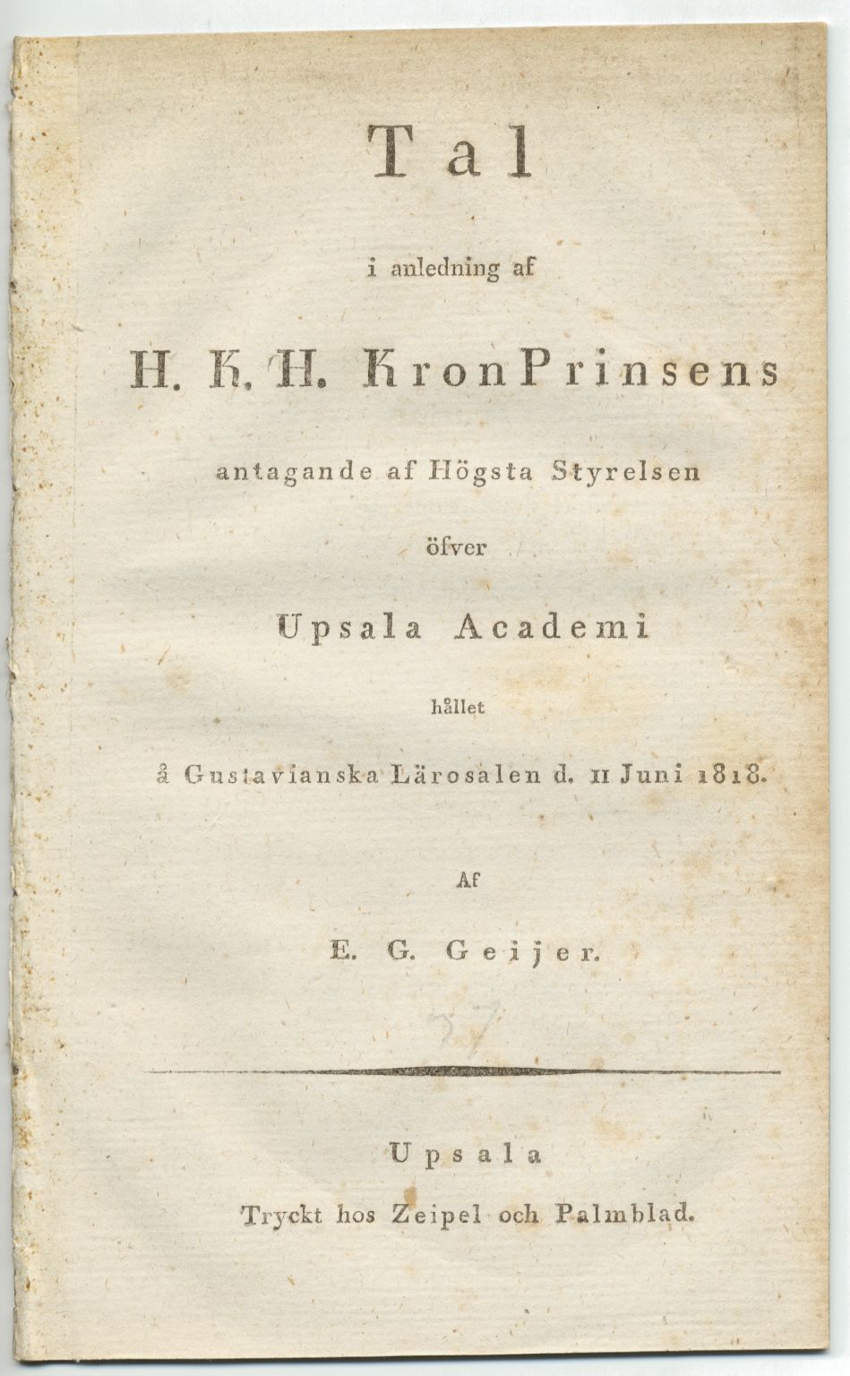Tal i anledning af h.k.h. kronprinsens antagande af högsta styrelsen öfver Upsala academi hållet å Gustavianska lärosalen d. 11 juni 1818.