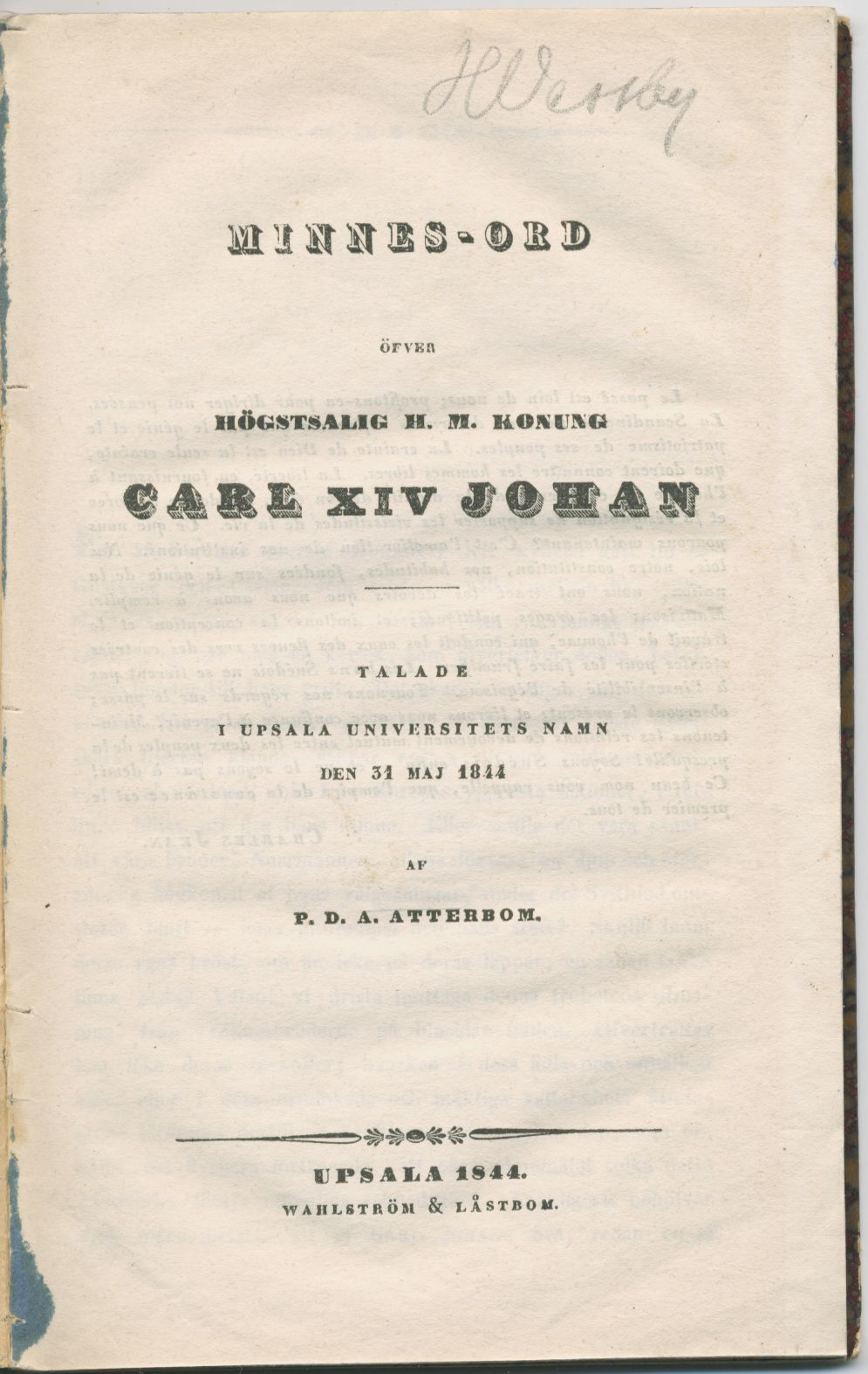 Minnes-ord öfver högstsalig h.m. konung Carl XIV Johan talade i Upsala universitets namn den 31 maj 1844.