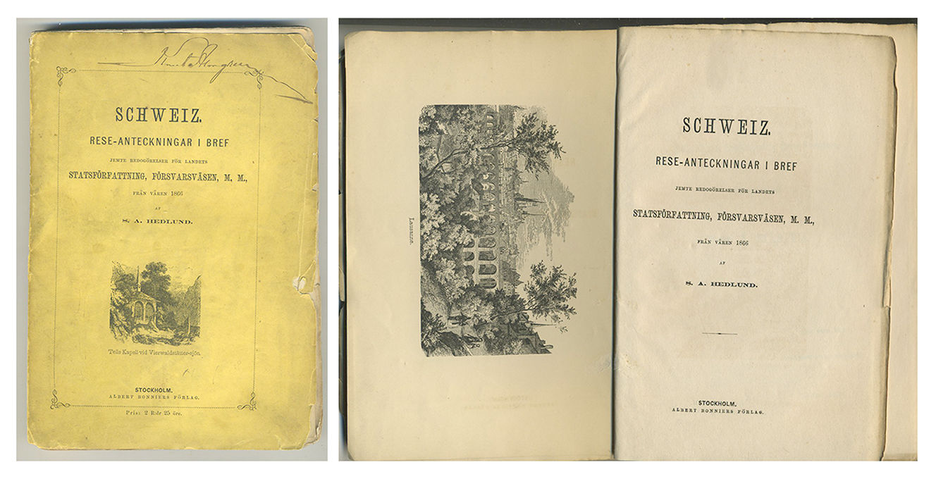 Författaren passerade även Tyskland på sin resa. Väl i Schweiz ägnar han försvarsväsendet och arméns organisation en särskild uppmärksamhet, liksom statsskicket. Huvuddelen av texten publicerades fortlöpande under resan i ”Göteborgs handels- och sjöfarts-tidning”. Frontespisen i träsnitt föreställer Lausanne. På främre omslaget en träsnittsvinjett ”Tells kapell vid Vierwaldstätter-sjön”.