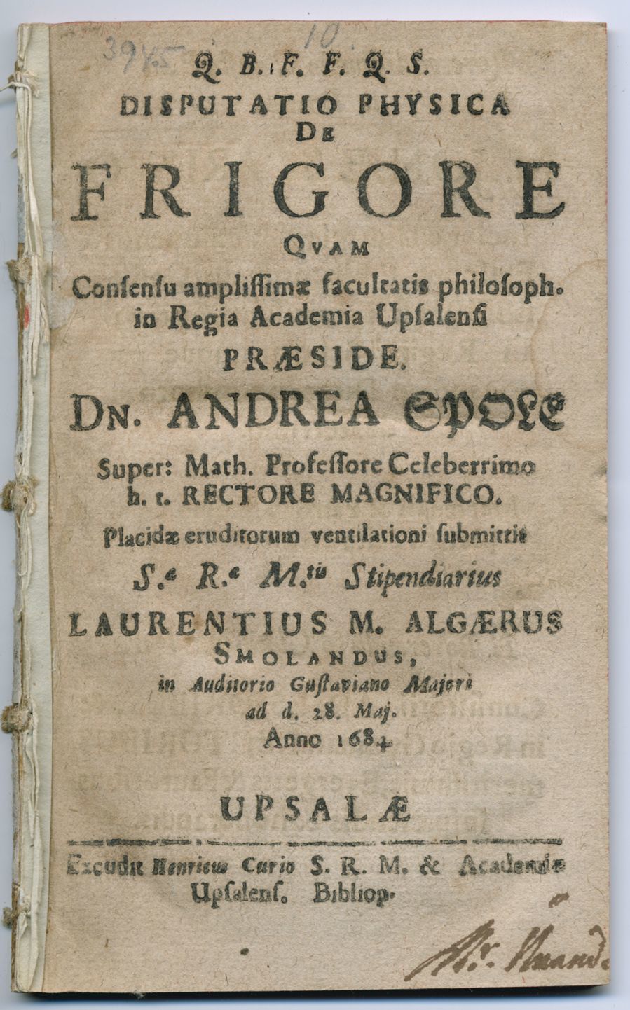 Lidén Catalogus disputationum 10. Bibliotheca Rudbeckiana 587 (fanns inte i Johannes Rudbecks samling). Om kölden. Det latinska ordet ”algidus” betyder kall och Petrus Rudbeckius ordvitsar om detta och respondentens namn i sin hyllningsvers på s. (6). I slutet även hyllningar av Sven Giöther, Joh. Lindelius, D. Schrey, Adam Leyell och Henric Leyell samt en avslutande vers av S. Kadow: ”Slicka ey på jernet när det myckit kalt är/ hända kan tin tunga blifwer sittiandes där. / Pas ey på att neka köldennes stoora macht / des natur här wijsas / lääs genom med gran acht”.