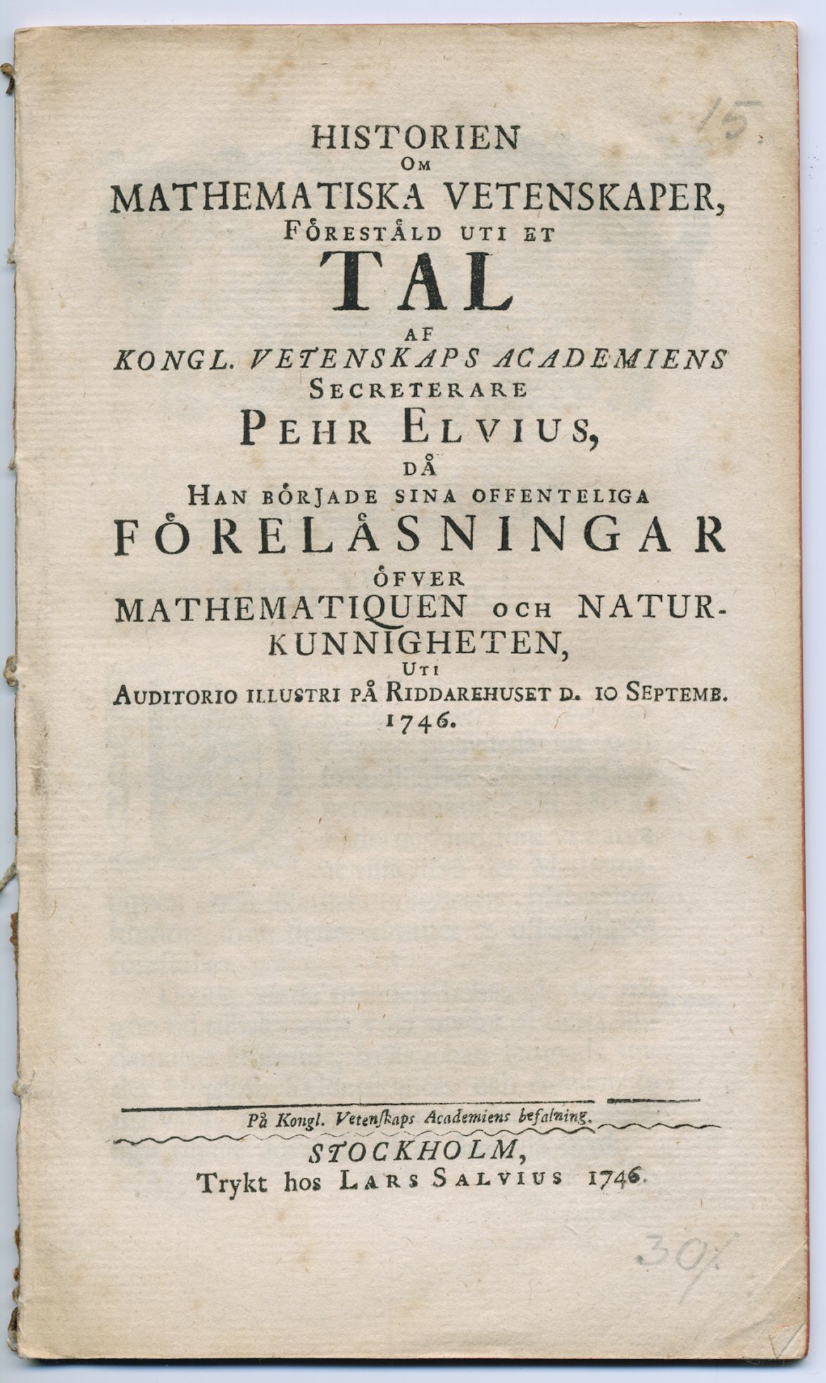 Historien om mathematiska vetenskaper, förestäld uti et tal af kongl. Vetenskaps academiens sekreterare Pehr Elvius, då han började sina offentliga föreläsningar öfver mathematiquen och naturkunnigheten, uti auditorio illustri på Riddarehuset d. 10 septemb. 1746.