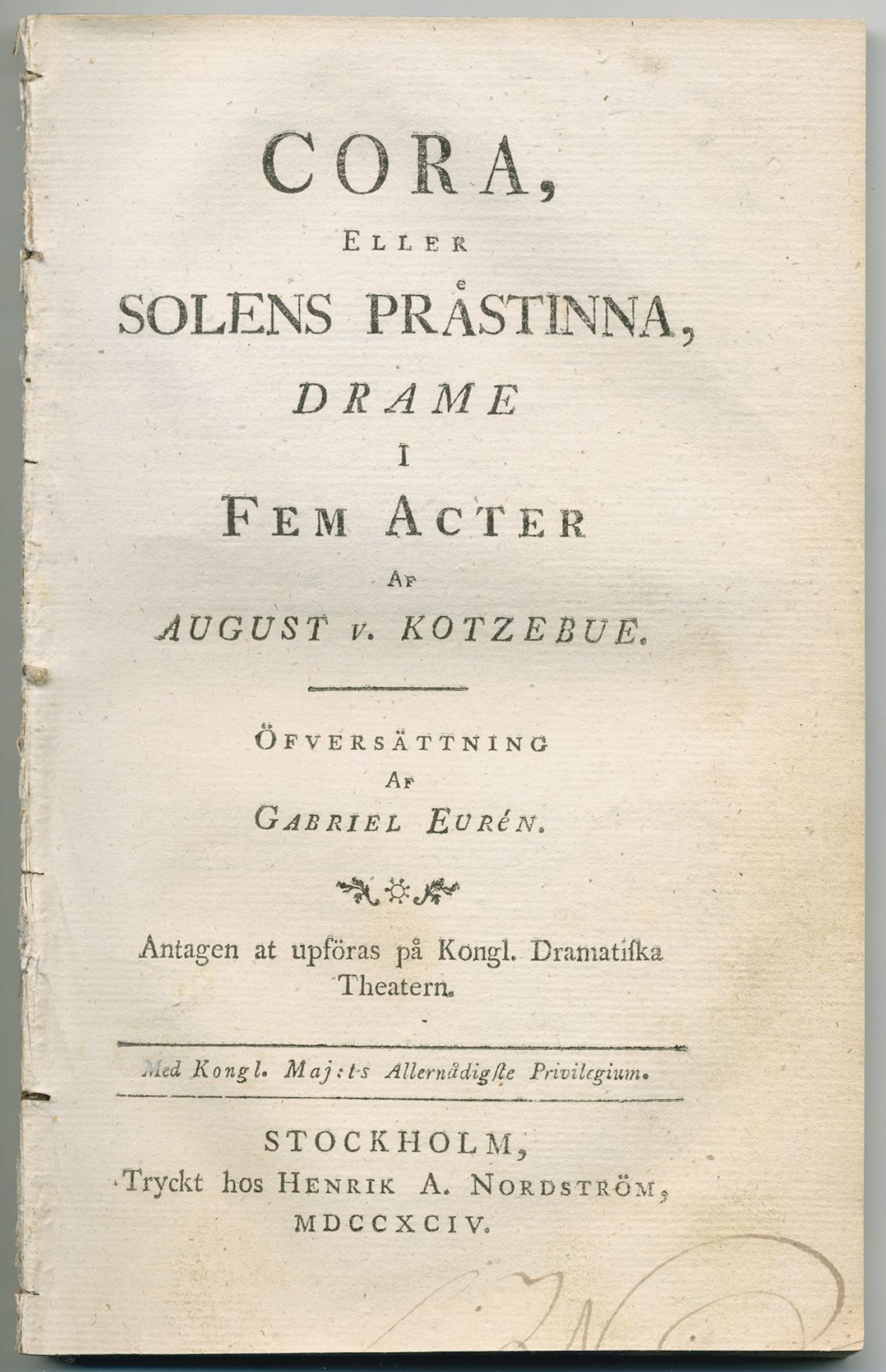 Cora, eller Solens prästinna, drame i fem acter. Öfversättning af Gabriel Eurén. Antagen at upföras på Kongl. dramatiska theatern.
