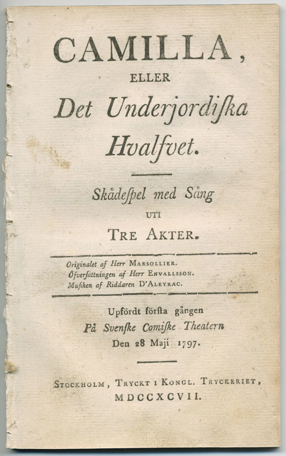 Camilla, eller det underjordiska hvalfvet. Skådespel med sång uti tre akter. Originalet af herr Marsollier. Öfversättningen af herr Envallsson. Musiken af riddaren D’Aleyrac. Upförd första gången på Svenske comiske theatern den 28 maji 1797.