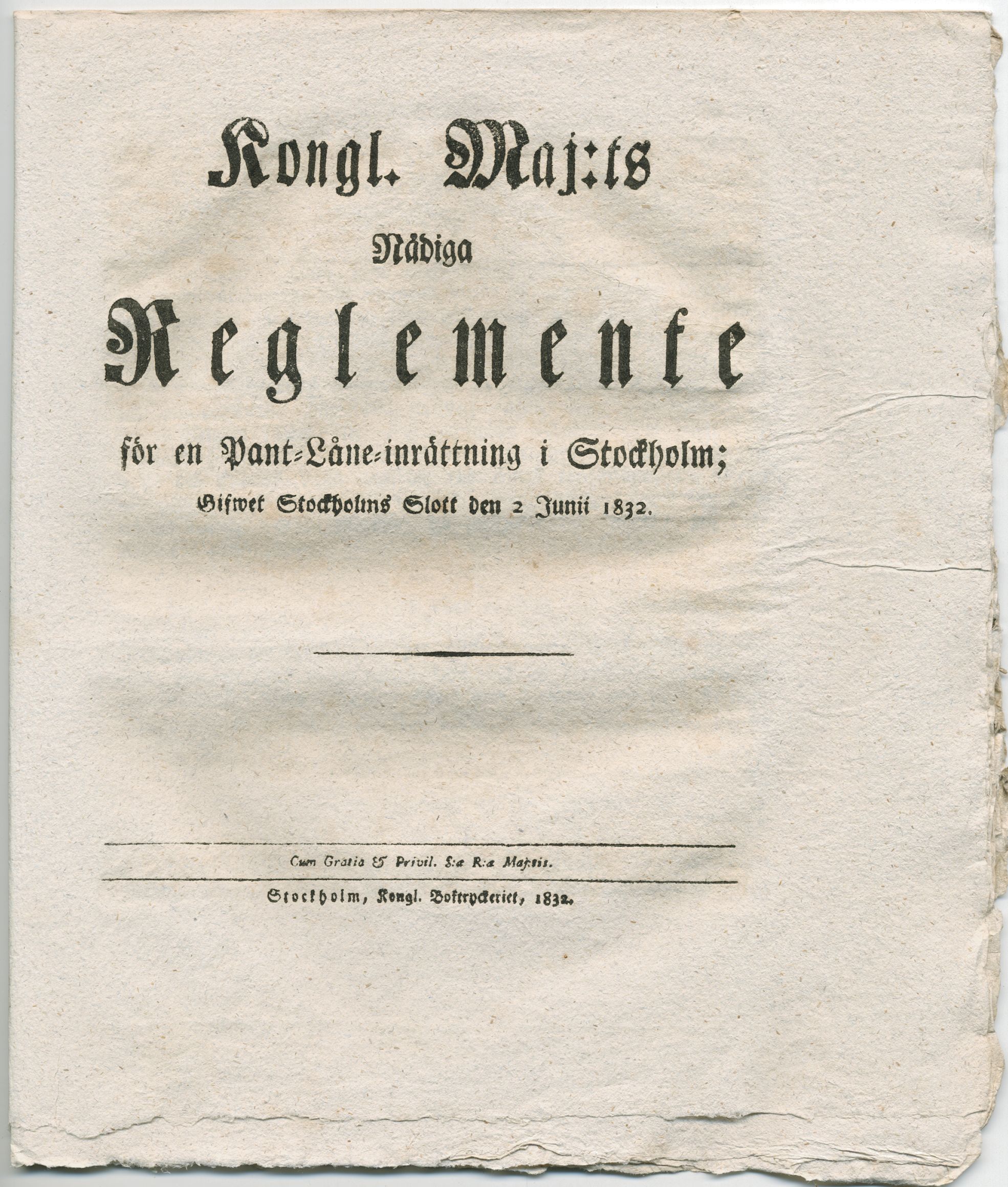 Kongl. maj:ts nådiga reglemente för en pant-låne-inrättning i Stockholm; gifwet Stockholms slott den 2 junii 1832.