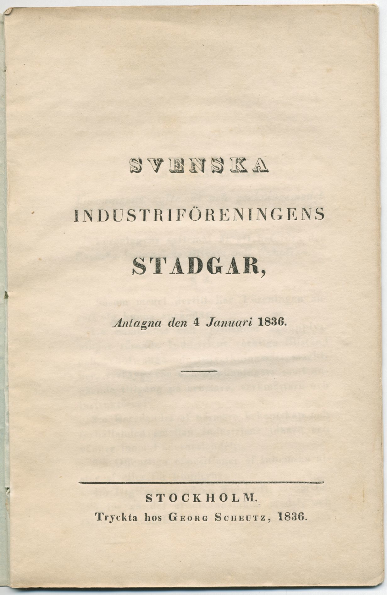 Svenska industriföreningens stadgar, antagna den 4 januari 1836.