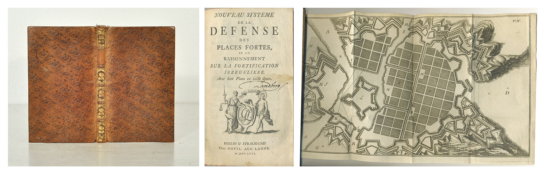 Berlin och Stralsund, chez G. A. Lange, 1766. 8:o. (2),86 s. & 8 utvikbara grav. plr. Med grav. titelvinjett. Samtida marmorerat skinnbd med upphöjda bind, guldornerad rygg och tyvärr bortfallen titeletikett. Kantförgyllning och röda snitt. Inlagan med enstaka fläckar. En lite större svag fläck på titelbladet. Flera understrykningar i rött bläck. Samtida namnteckning ”Landberg” på titelbladet. Bra ex.