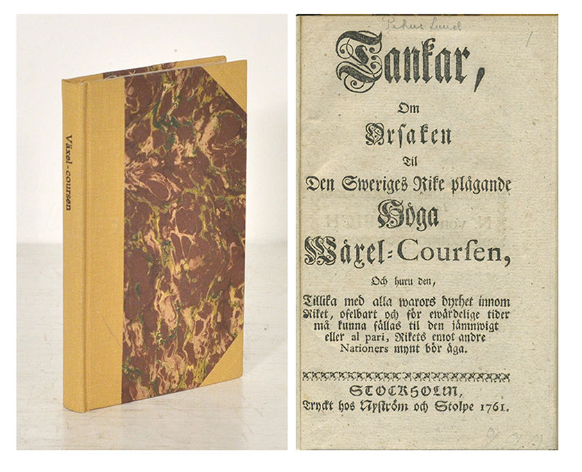 Sthlm, Nyström och Stolpe, 1761. 8:o. 40 s. + (EHRENHOFF, CARL GUSTAF) Någre anmärkningar, wid en nyligen af trycket utkommen skrift, kallad Utdrag af föreläsningar, angående den i Swea rike upkomne wäxel-coursen, til des beskaffenhet, orsaker och påfölgder. Stockholm d. 27 october 1761. Sthlm, Kongl. tryckeriet, (1761). 8:o. 30,(2 blanka) + (LUND, PETER) Genswar uppå swaret, angående projectet om et banco-contoirs inrättande, hwarigenom wäxel-coursen må kunna fällas, jemte någre förslaget gjorde tilläggningar. Sthlm, Nyström och Stolpe, 1761. 8:o. 21 s. + (THAM, PEHR) Svar på projectet om et banco contoirs inrättande. Uti skriften, Tankar om orsaken til den Sveriges rike plågande höga wäxel-coursen. Sthlm, P. Hesselberg, 1761. 8:o. 8 s. + (LUND, PETER) Tilläggningar angående projectet af et banco- wäxel-contoire, til wäxel-coursens fällande. Sthlm, Nyström och Stolpe, 1761. 8:o. 78,(1) s. + (LUND, PETER) Genswar uppå swaret, angående projectet om et banco-contoirs inrättande, hwarigenom wäxel-coursen må kunna fällas, jemte någre förslaget gjorde tilläggningar. Sthlm, Nyström och Stolpe, 1761. 8:o. 23 s. Nytt gult hklbd med marmorerat pärmpapper och svarttryckt ryggtitel: ”Växel-coursen”. Andra arbetets titelblad bruntonat och med litet pappersfel i nedre marginalen. Thams korta arbete bruntonat. Intressant samlingsband.