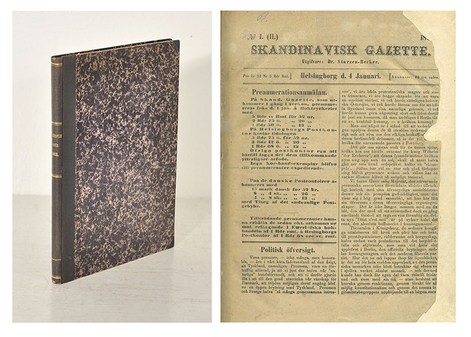 Helsingborg, G. Ewerlöf, 1862. 4:o. 161-592 spalter. Svart hklbd från början av 1900-talet med guldlinjerad rygg. Med tidningsbevillningsstplr. Något bruntonad inlaga. Första bladet med stor uppfodrad skada i yttermarginalen med någon textförlust. Några bläck- och fuktfläckar. Adresstillskrifter Staby. Inköpsanteckning från bokauktion i Stockholm 1934 där volymen kostade 2:25.