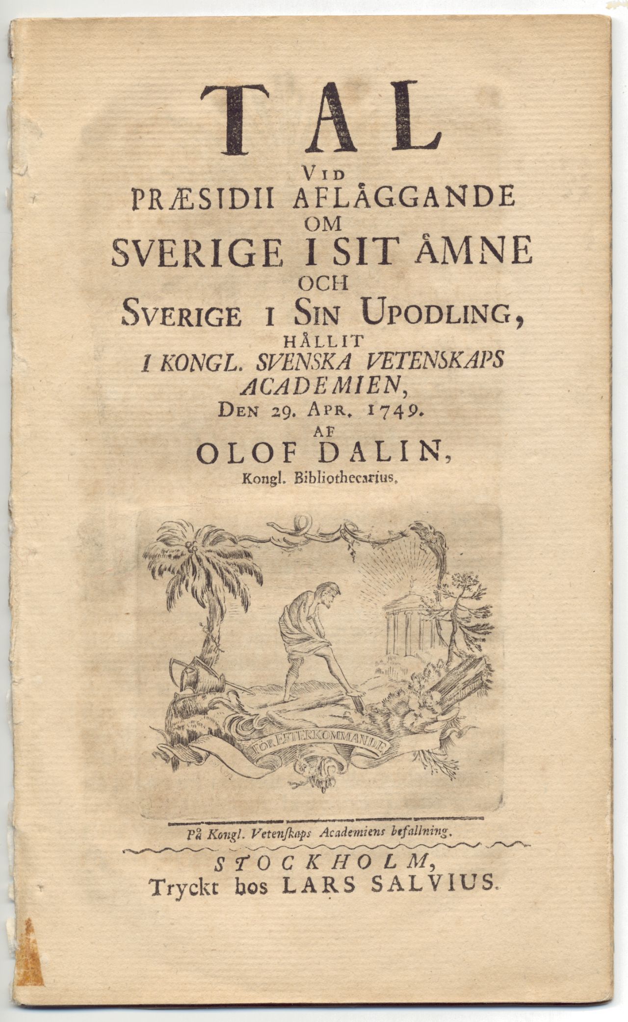 Tal vid præsidii afläggande om Sverige i sit ämne och Sverige i sin upodling, hållit i kongl. svenska Vetenskaps academien, den 29 apr. 1749.